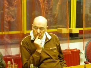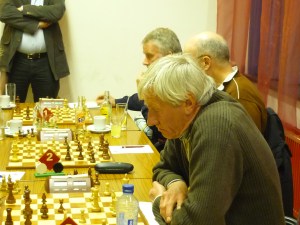 Bleef over Herman Snelders. Die wikkelde af naar een stelling met een loper tegen een paard en elk een toren en zes pionnen. Wat was sterker het paard of de loper. Die discussie kende geen uitkomst, want Herman wist een ver opgerukte pion op a6 te veroveren, en er was weer hoop op een gelijkspel. Het werd een toreneindspel met wit een toren en zwart (Herman) een toren en de f en h pion en ook nog meer tijd. De tegenstander had dit eindspel nog gehad op een kursus van Sokolov. Had niet alles onthouden, maar wist wel dat je dit remise kunt houden. Dat lukte hem uiteindelijk ook omdat Herman zijn toren op een verkeerd veld neer zette. Hierdoor kon de h-pion zo het doosje in. Had hij dit niet gedaan dan had hij de tegenstander door de klok kunnen jagen want die had nog maar 36 seconden.