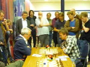 Helaas net niet dus. Teleurstellend voor ons en voor het publiek waarvan velen hoopten op een zinderend snelschaakduel. Het heeft niet mogen zijn. Foto’s worden aan dit verslag toegevoegd zo gauw Jan Peek ze naar mij heeft gestuurd.