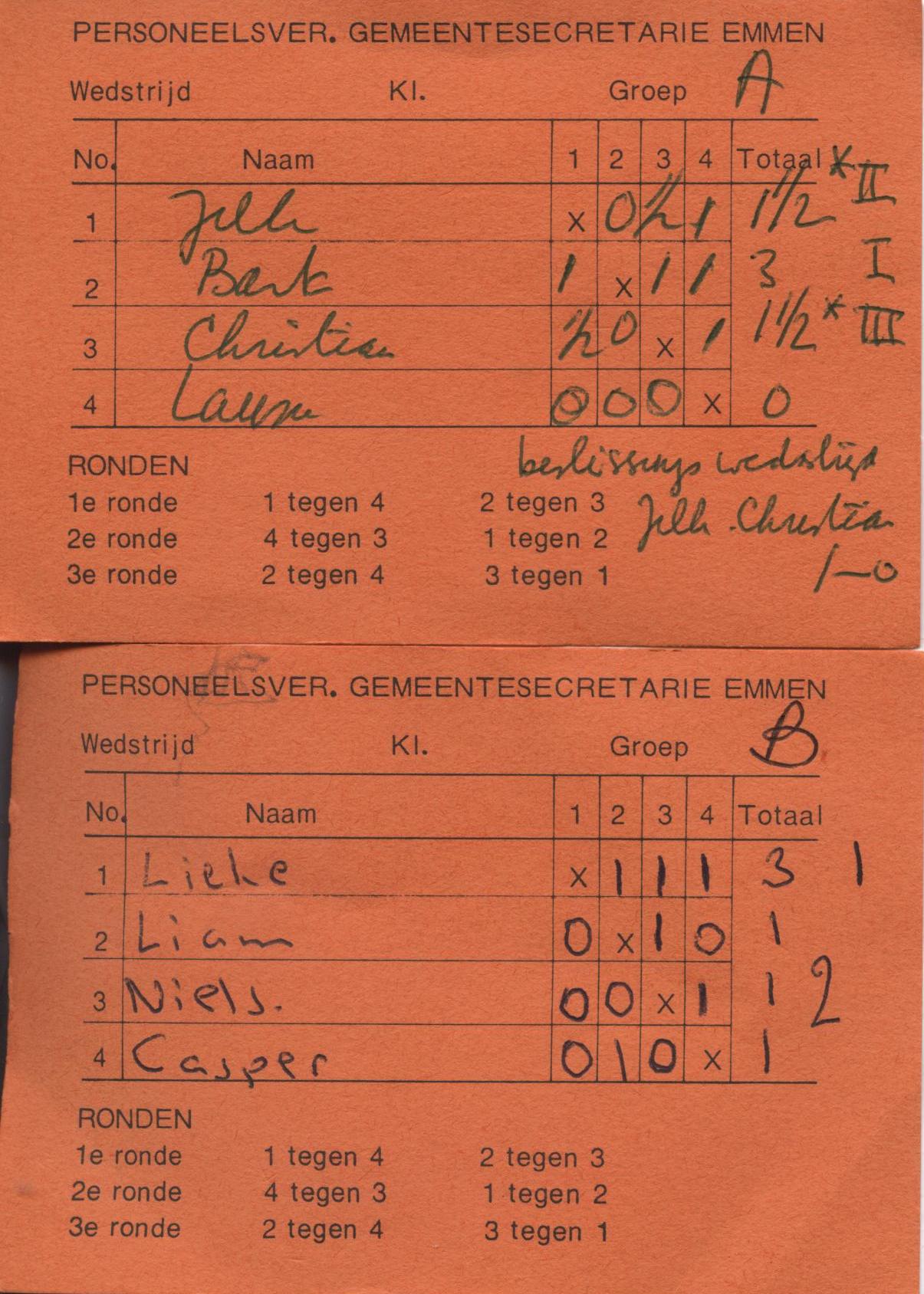 In Groep B was Lieke met 3-3 de jongens de baas. Liam,Niels en Casper eindigden met een punt met zijn drieen op de gezamelijke tweede plaats.