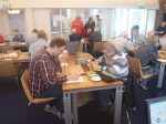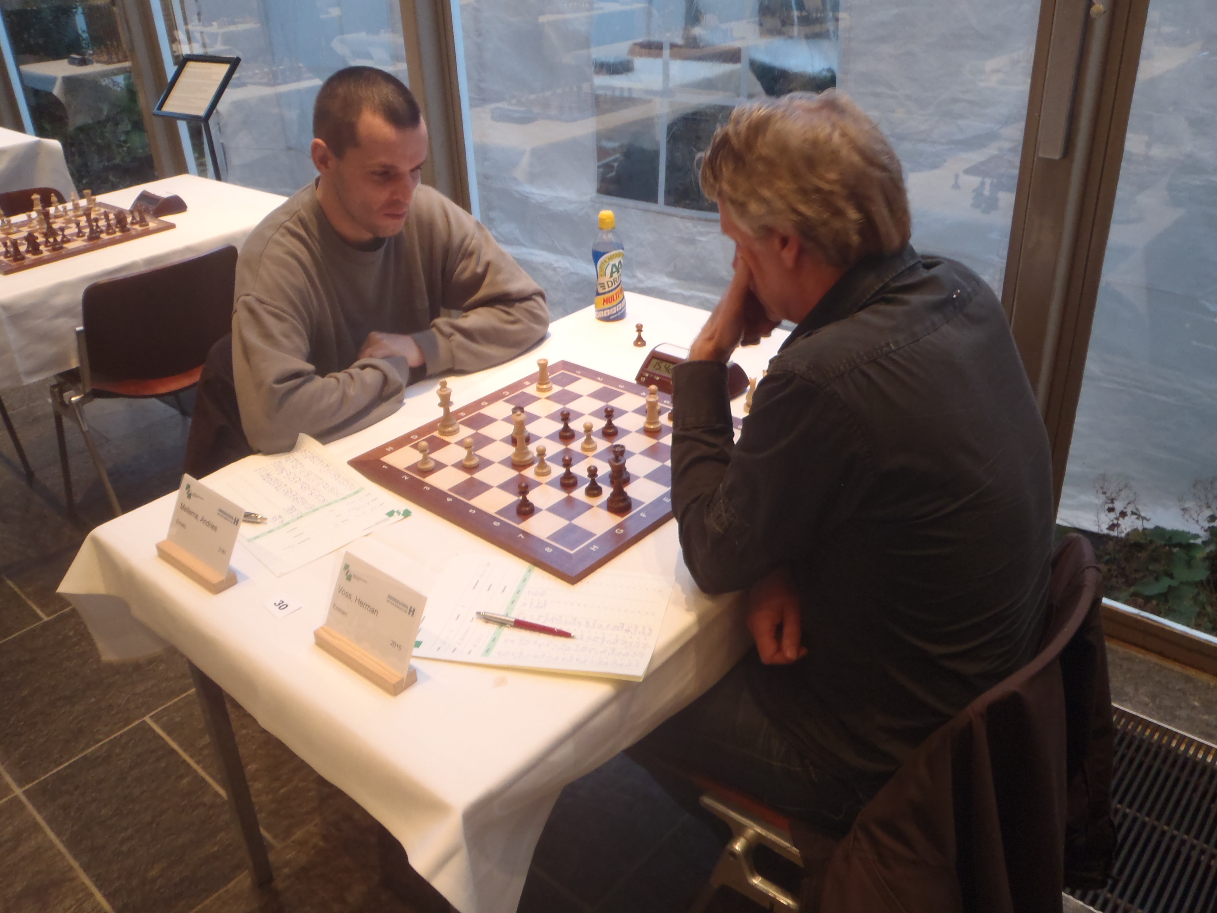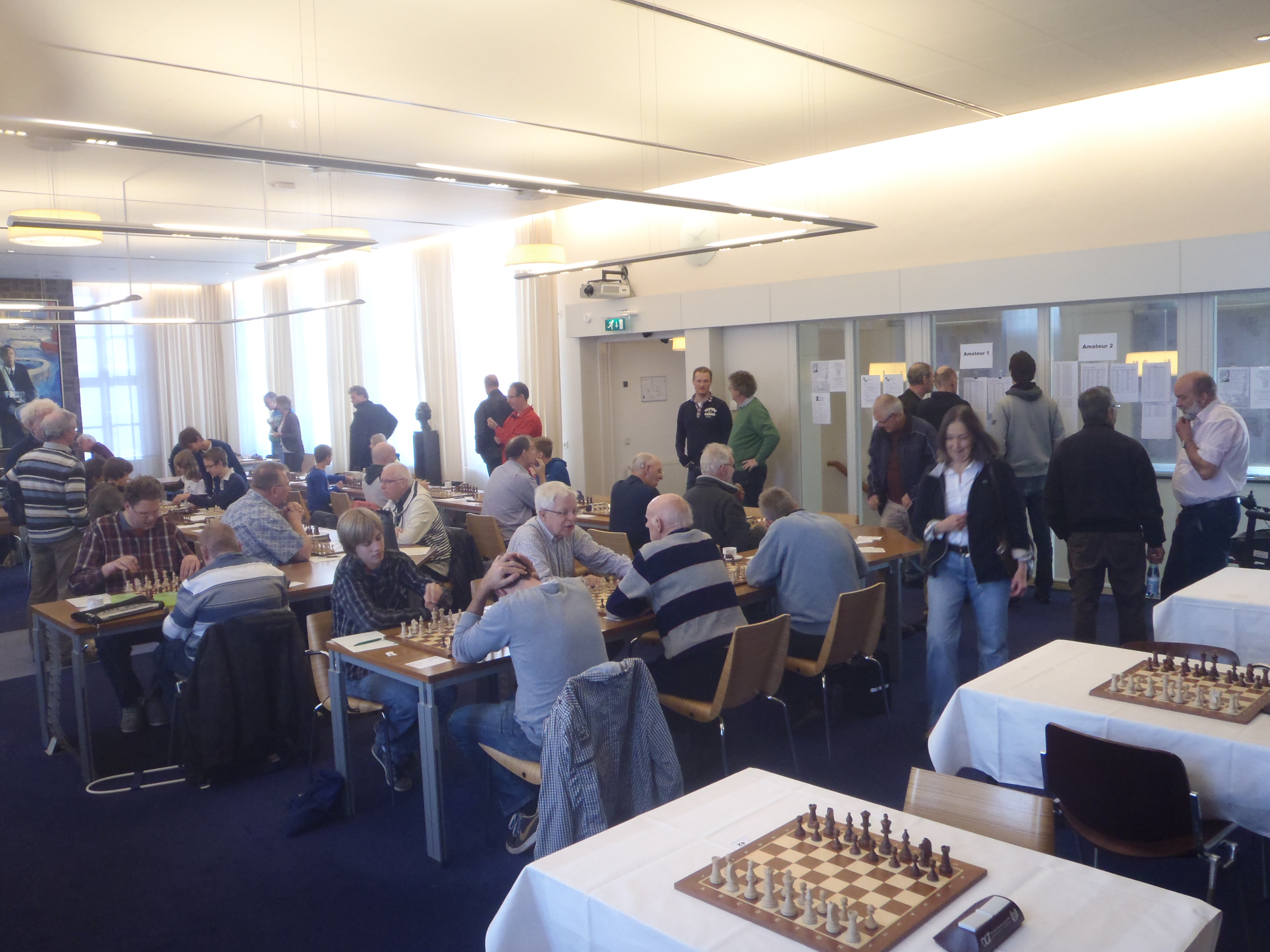 Bastiaan en Ruud zitten al aan het bord, Ton praat met Christiaan Mol