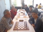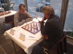 Ton kreeg een stelling op het bord waar een vijandelijke toren op de onderste rij schaak kon geven. Met Lf1 werd dit gepareerd, maar de loper op c1 en de toren op a1 waren er volgens mij niet blij mee. Ton loste de problemen op ten koste van een pion. De tegenstander maakte optimaal gebruik van de pion meer en gaf Ton geen kans om er een remise uit te slepen. Hierdoor is onze kopman van de eerste ronden nu voorbijgestreefd door de drie andere ESG-ers. Bastiaan is nu met 4,5 de hoogste, gevolgd door Ruud met 4. Ton en Jan hebben er 3,5.