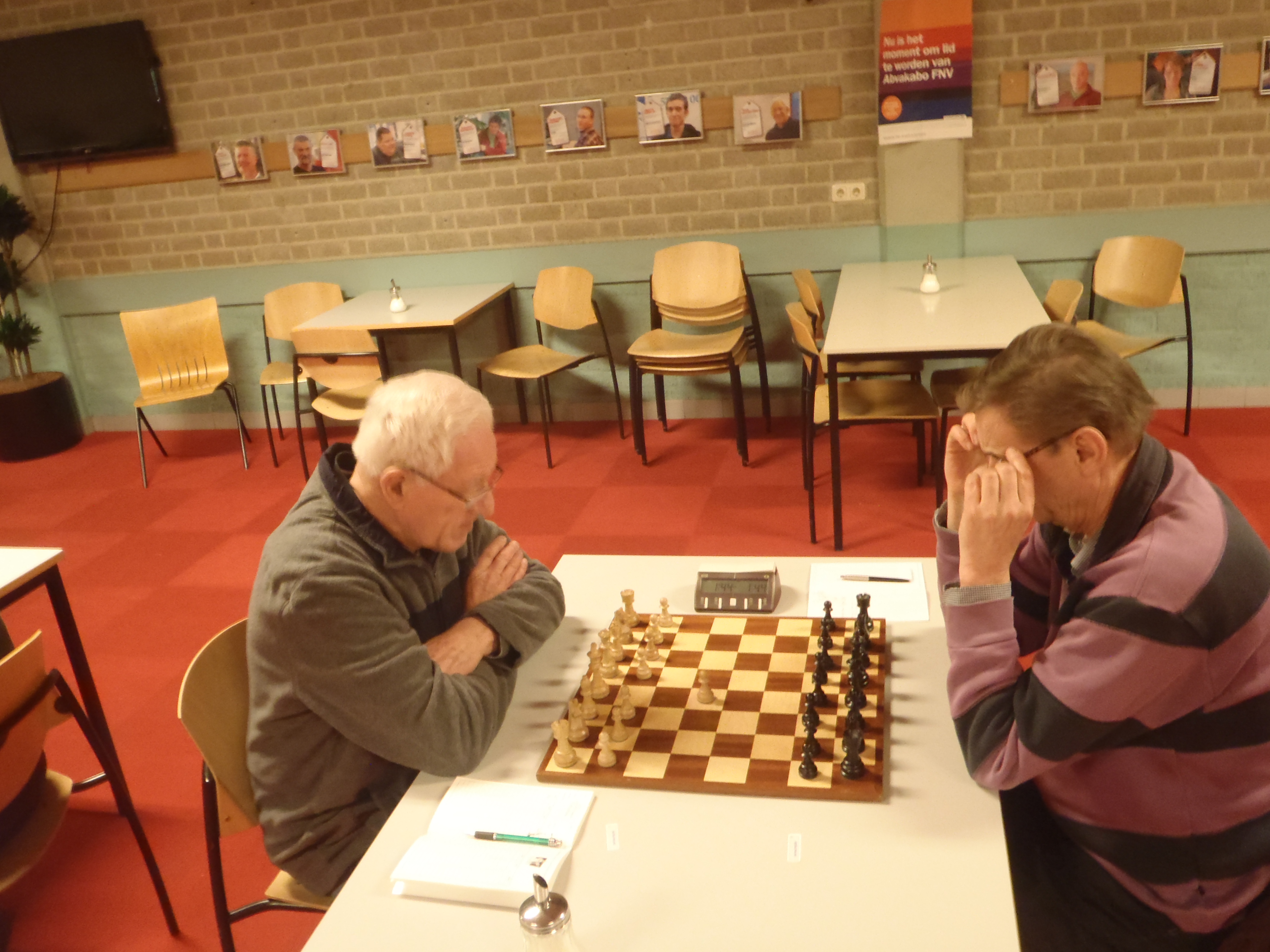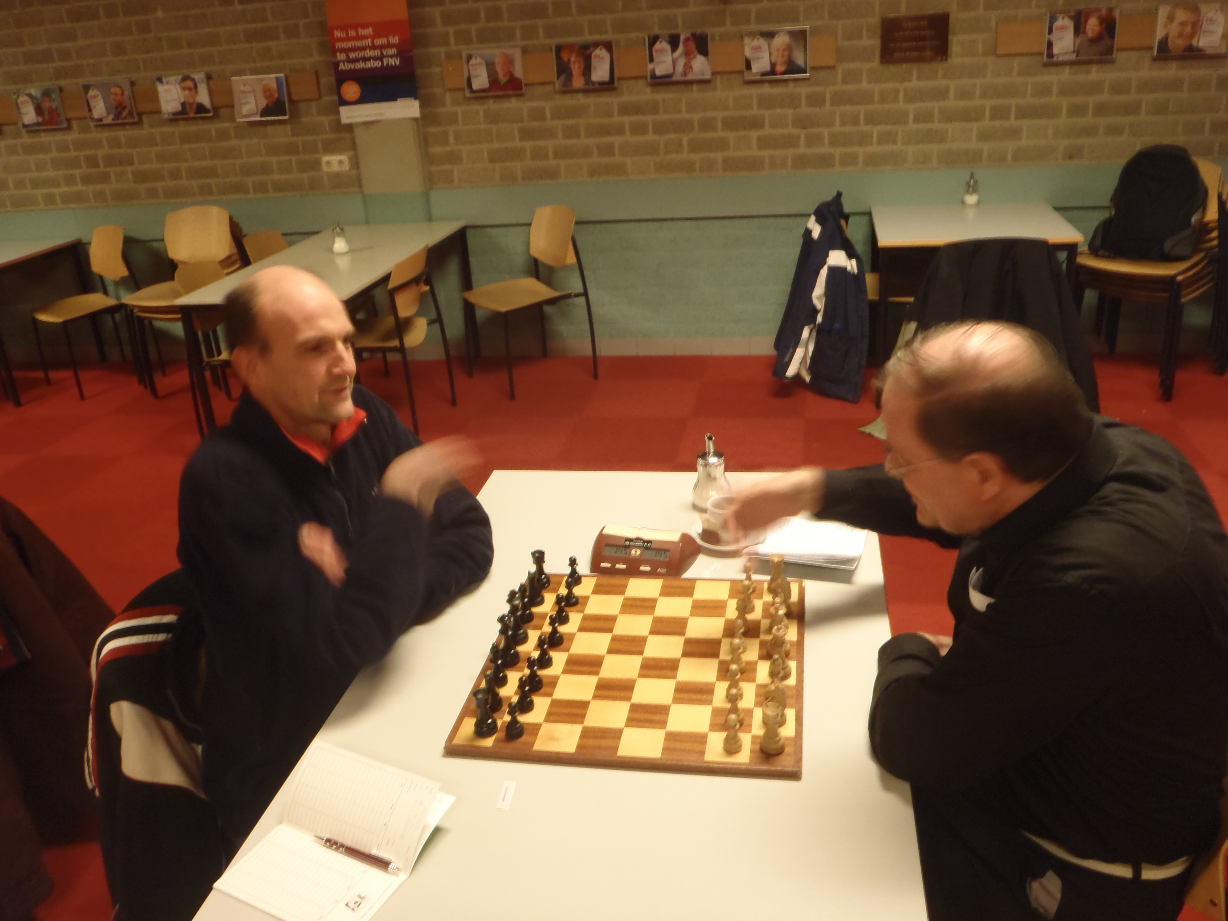 Voordeel van het vroege klaar zijn was voor Herman toch ook dat hij nu van alle andere partijen kon genieten. De eerstvolgende partijen werden pas in de laatste minuten van de eerste tijdcontrole beslist. Als eerste was daar Jan die een overwinning aantekende. Gaf in de opening eigenlijk een pion weg, maar de tegenstander Henk Pompstra wou die niet nemen. Jan kon daarna opnieuw beginnen en deed dat voorvarend. Na 25 zetten hadden beide spelers nog maar vijf minuten over, maar Jan wist met enkele krachtzetten een koningsaanval op te zetten en die ook redelijk makkelijk af te ronden. Beide heren concludeerden na afloop dat al hun onderlinge duellen wel sensationeel en taktisch zijn geweest (0,5-1,5).