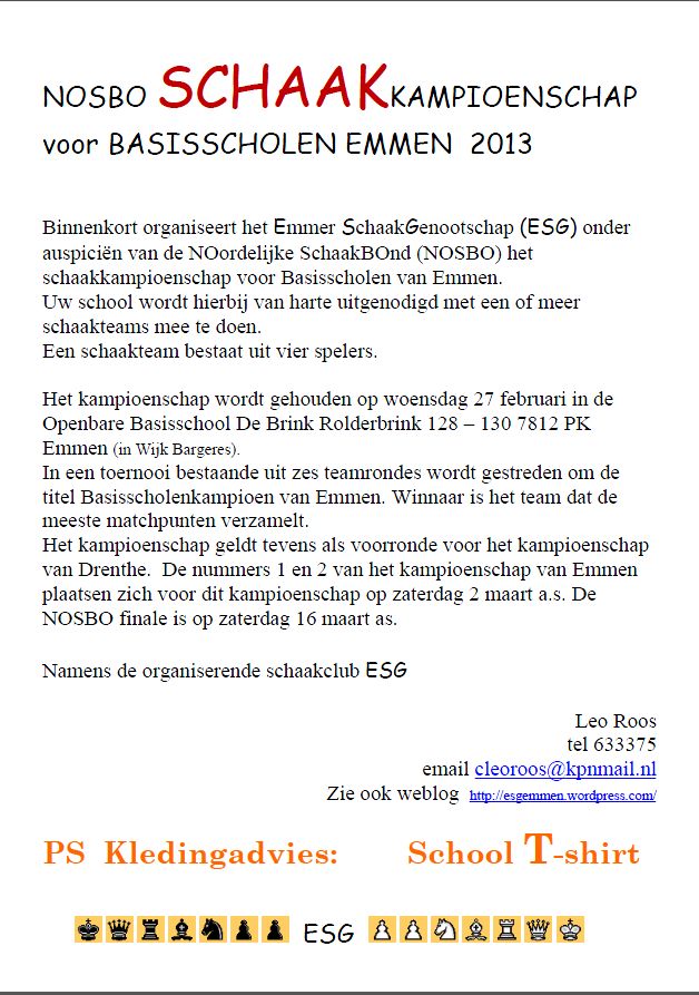 Woensdag 27 februari organiseert ESG weer het het BasisSchoolschaakKampioenschap van Emmen.