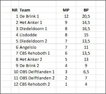 Het Anker werd verrassend tweede. De Brink en het Anker hebben zich hiermee geplaatst voor de Drentse tussenronde van het kampioenschap van de Noordelijke Schaakbond (NOSBO, Groningen en Drenthe). Deze tussenronde wordt aanstaande zaterdag in Zuidlaren gespeeld.