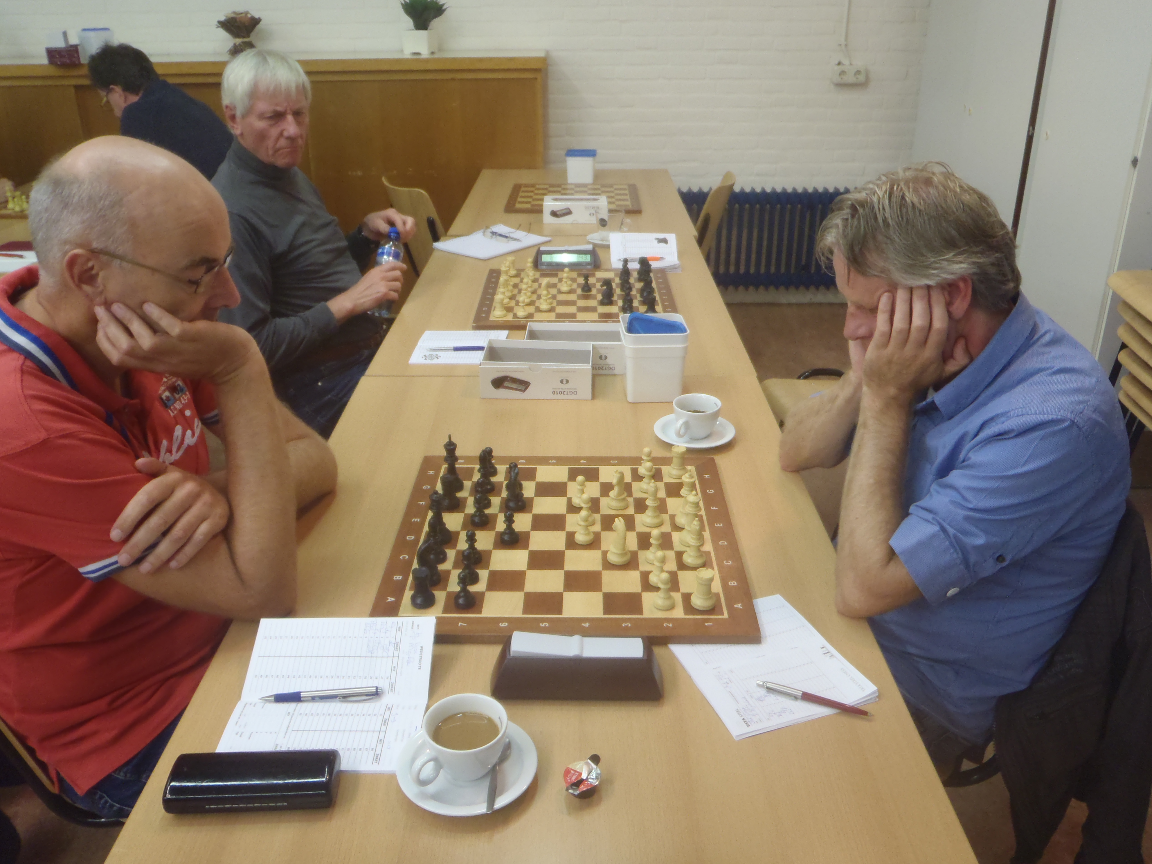 Bastiaan kon het niet bolwerken tegen Leo maar hoe dat ging? Ook Gerard kwam in een eindspel met 2 pionnen meer terecht, maar wel met nog vier torens op het bord. De slechte positie van de koning van Marcel maakte het echter een kansloze missie al liet Gerard ons nog wel veel varianten zien die niet direct naar winst leidden. Douwe doet het altijd op z`n Frans, maar Geert was niet onder de indruk. Daar kwam nog bij dat Douwe deze zomer geen tijd heeft gevonden eens iets aan tempotraining te doen.