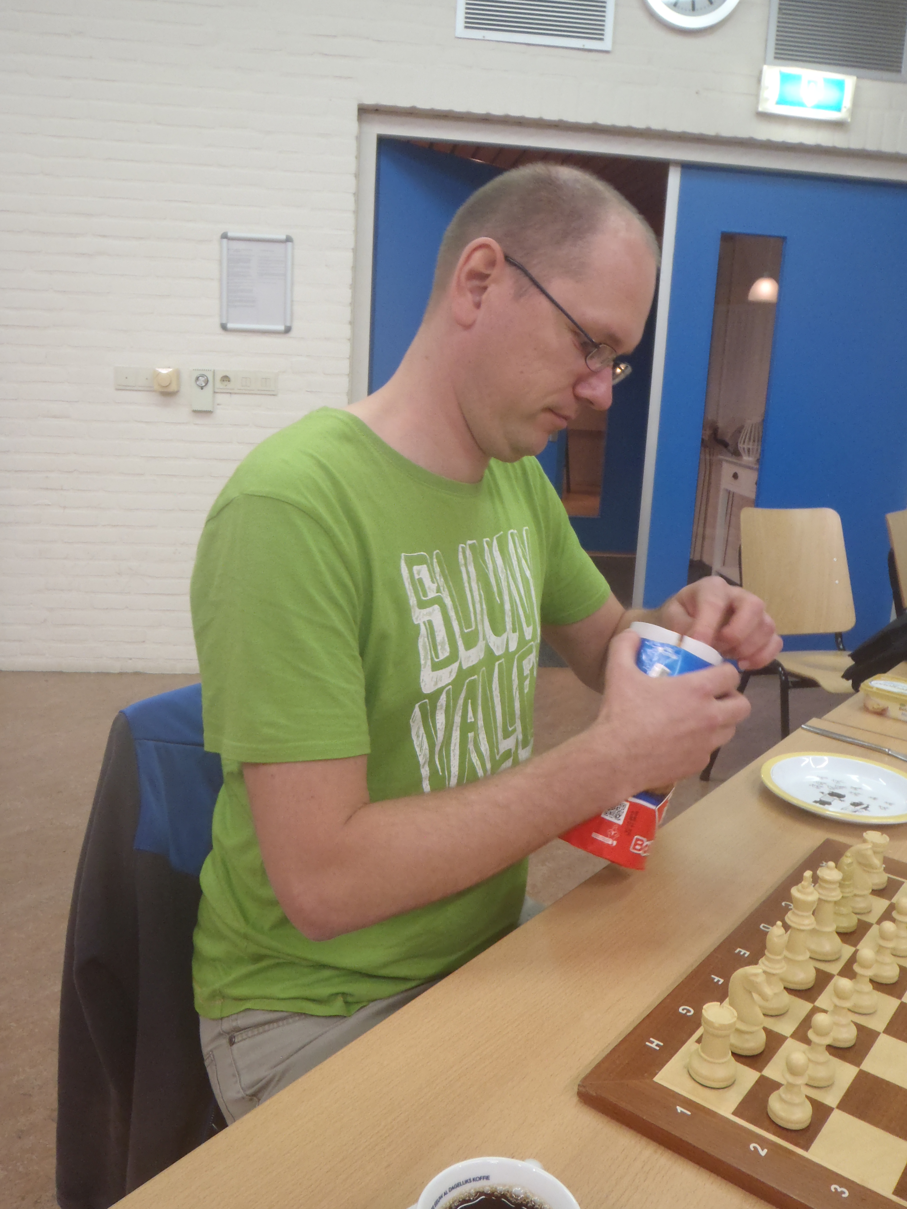 Hoe het verloop bij enkele partijen was heb ik niet allemaal kunnen volgen. Bij Hans en Willem was het wel gezellig geloof ik, met een biertje voor Hans en een punt voor Willem. Jan en Fred hielden elkaar goed in evenwicht en Erwin moet er eerst nog een beetje inkomen en verloor van Jurjen. Zelf ook nog geprobeerd een goede partij te spelen en dat leek aardig te lukken toen Jan de rokade uitstelde en te veel naar f2 zat te loeren. Na wat ge-ruil dacht Arie de stelling van Jan op te blazen en te kunnen winnen met een vrijpion op f6 en later zelfs f7. Door een smerige rookbom op toch f2 te laten ontploffen wist gladde Jan alle gevaar te neutraliseren met eeuwig schaak.