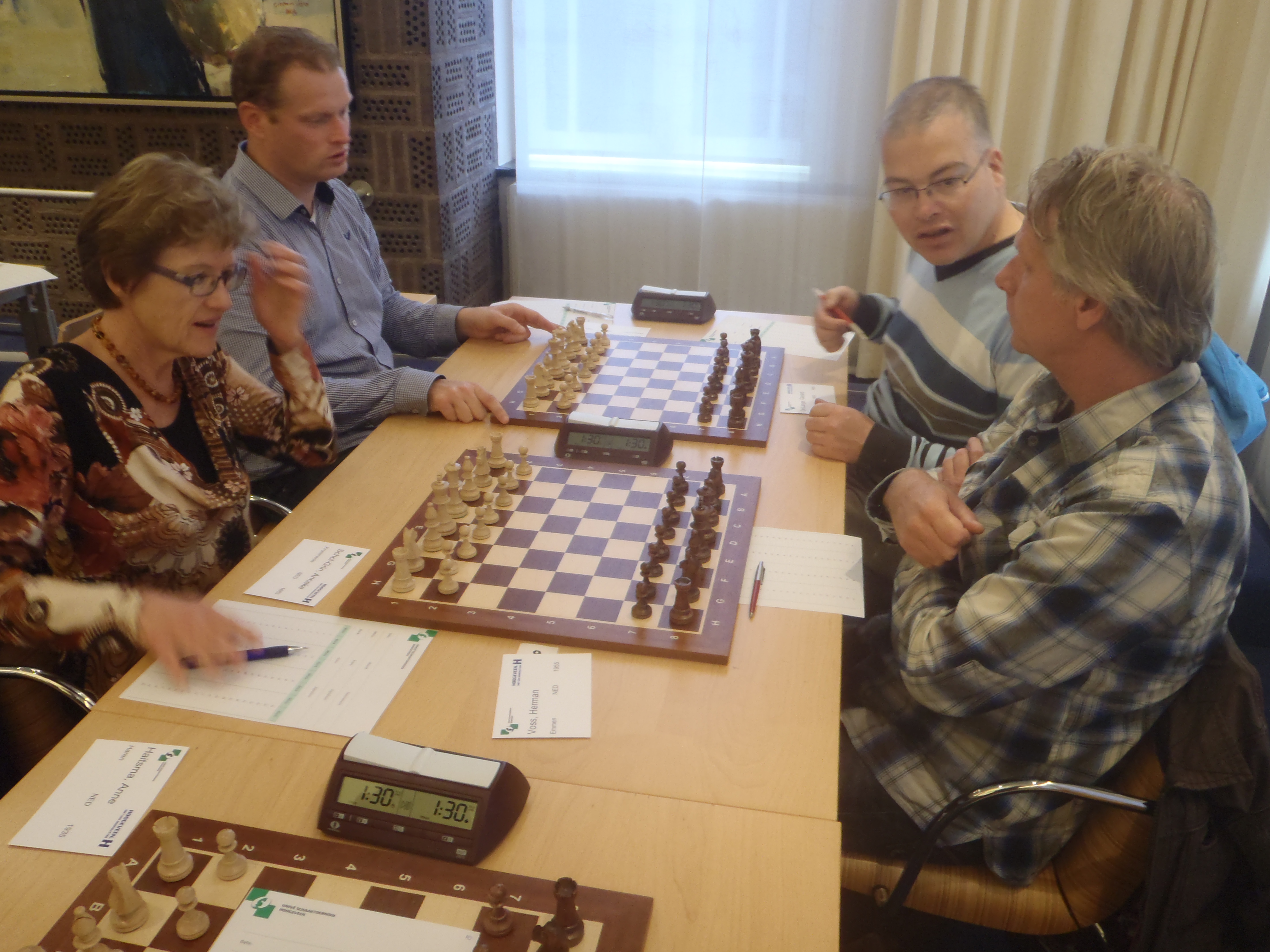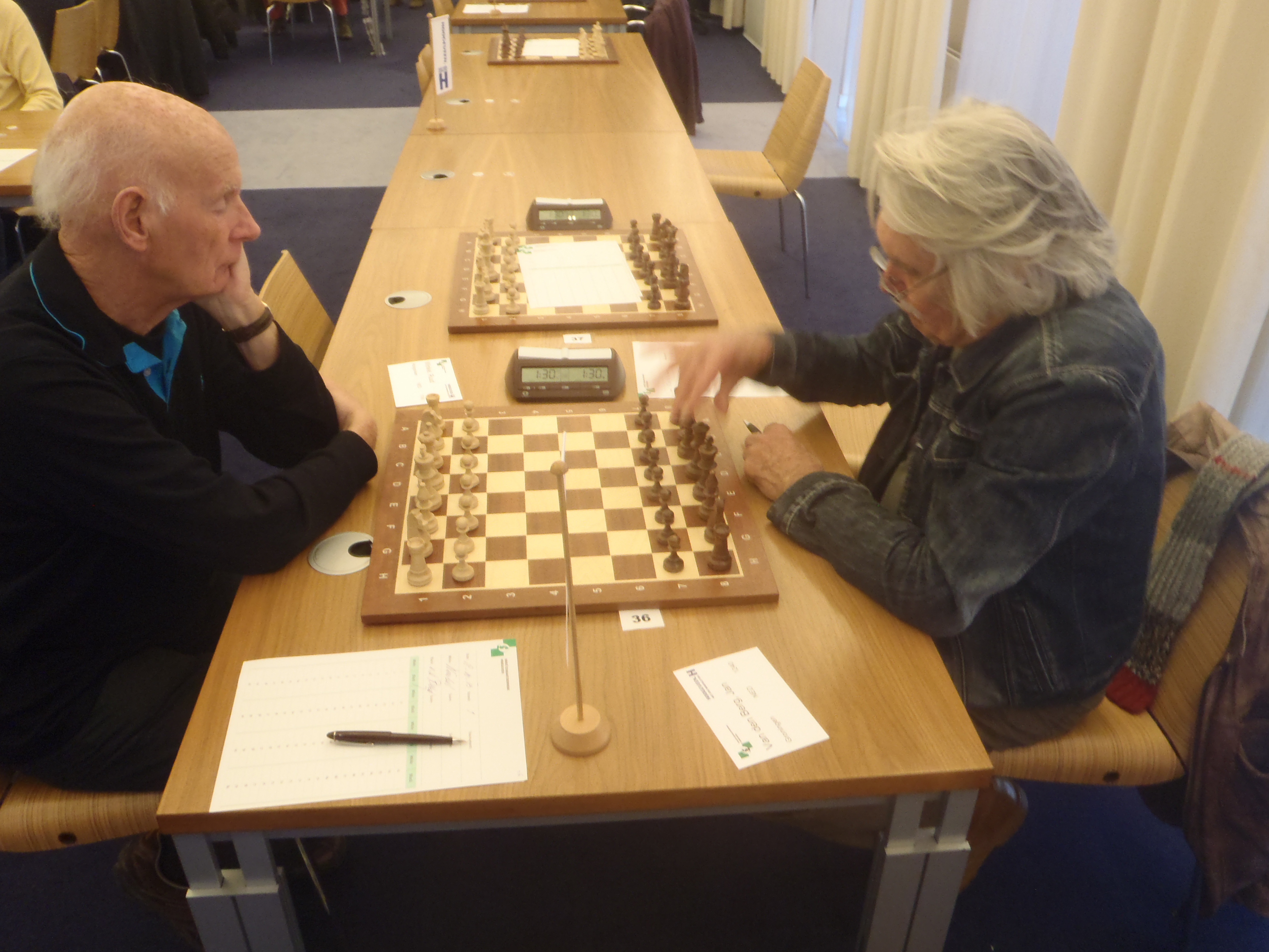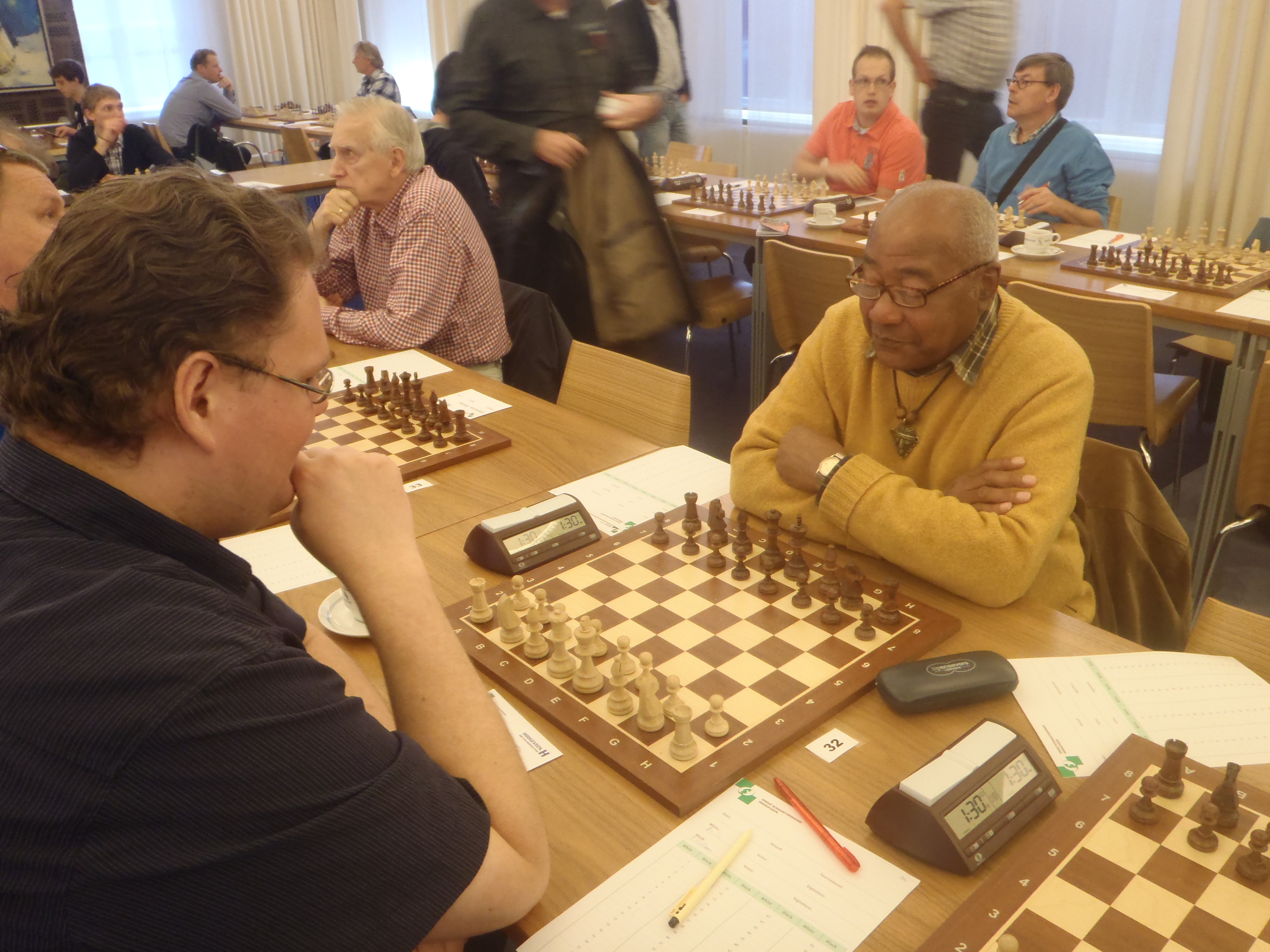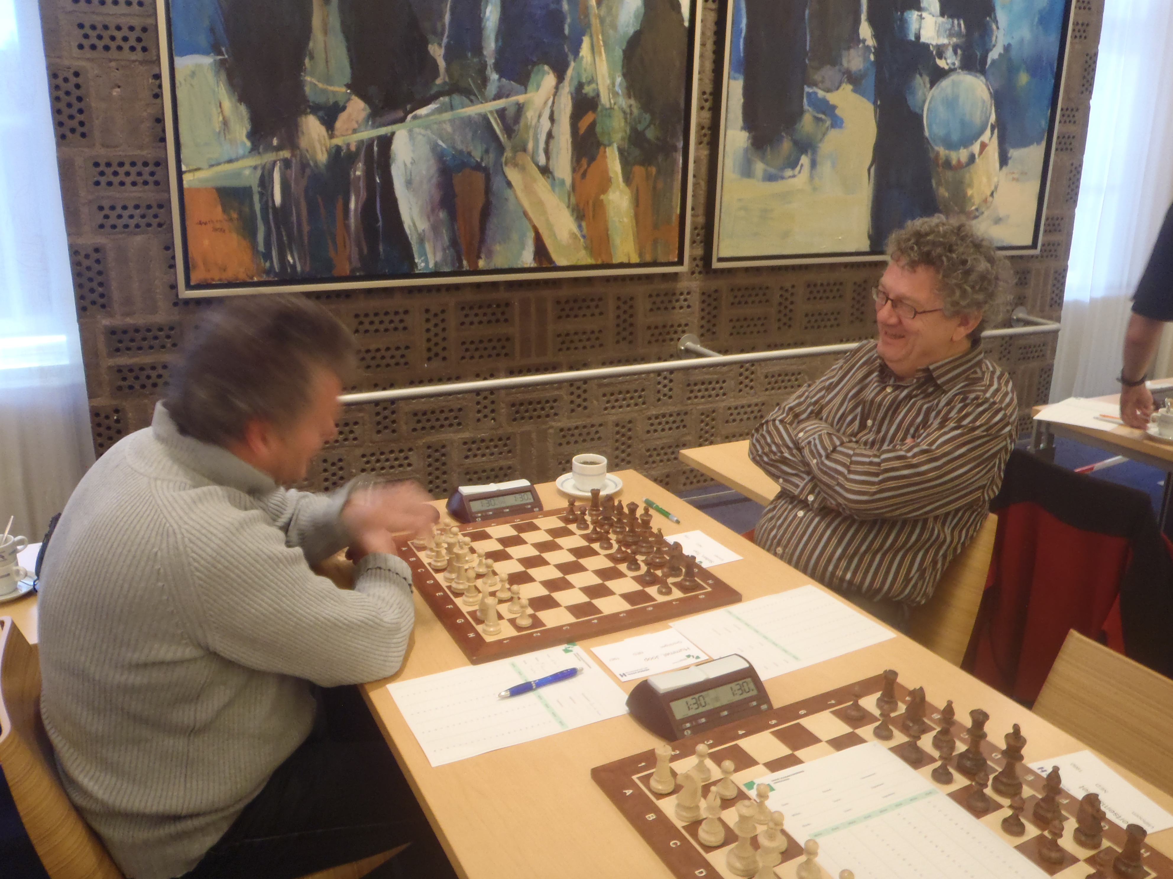 Evert wist zijn tegenstander te overrompelen en was als eerste klaar. De slotstelling was mooi om te zien. Evert had een stuk geslagen die niet teruggenomen kon worden zonder mat te gaan. Het stuk op d4 was genomen met schaak, dus de koning moest of naar f1 (mat) of naar h1 (torenverlies). Genoeg om op te geven.