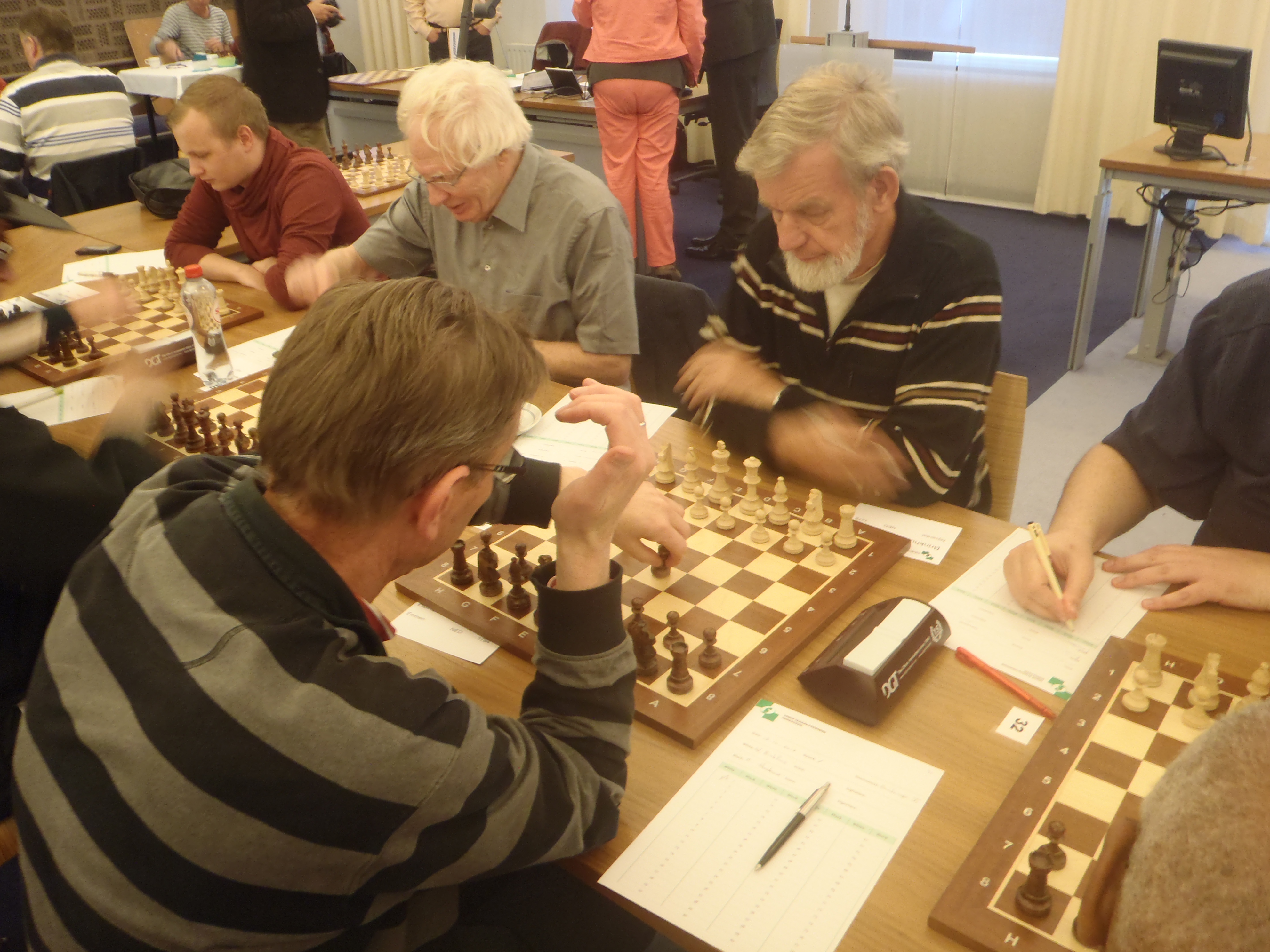 Als laatste aandacht voor onze kopman Arie die in de Open groep speelt. Vorig jaar ging het moeizaam met niet al te beste resultaten. Dit jaar is de start echter veelbelovend. Arie dronk dit keer geen gewoon water zoals we van hem gewend zijn, neen hij dronk water met een kleurtje. Was dat de reden dat hij veel energie had. In ieder geval wouden beide spelers lang hun stukken houden. Op het moment dat er al veel partijen uit waren was er op het bord van Arie slechts bij beide een paard, een loper en een pion van het bord verwijderd. Arie, met zwart, wist een pion te winnen en later de partij. En dat tegen een op papier veel sterkere tegenstander. Morgen mag Arie het proberen tegen Internationaal Meester Fred Slingerland.