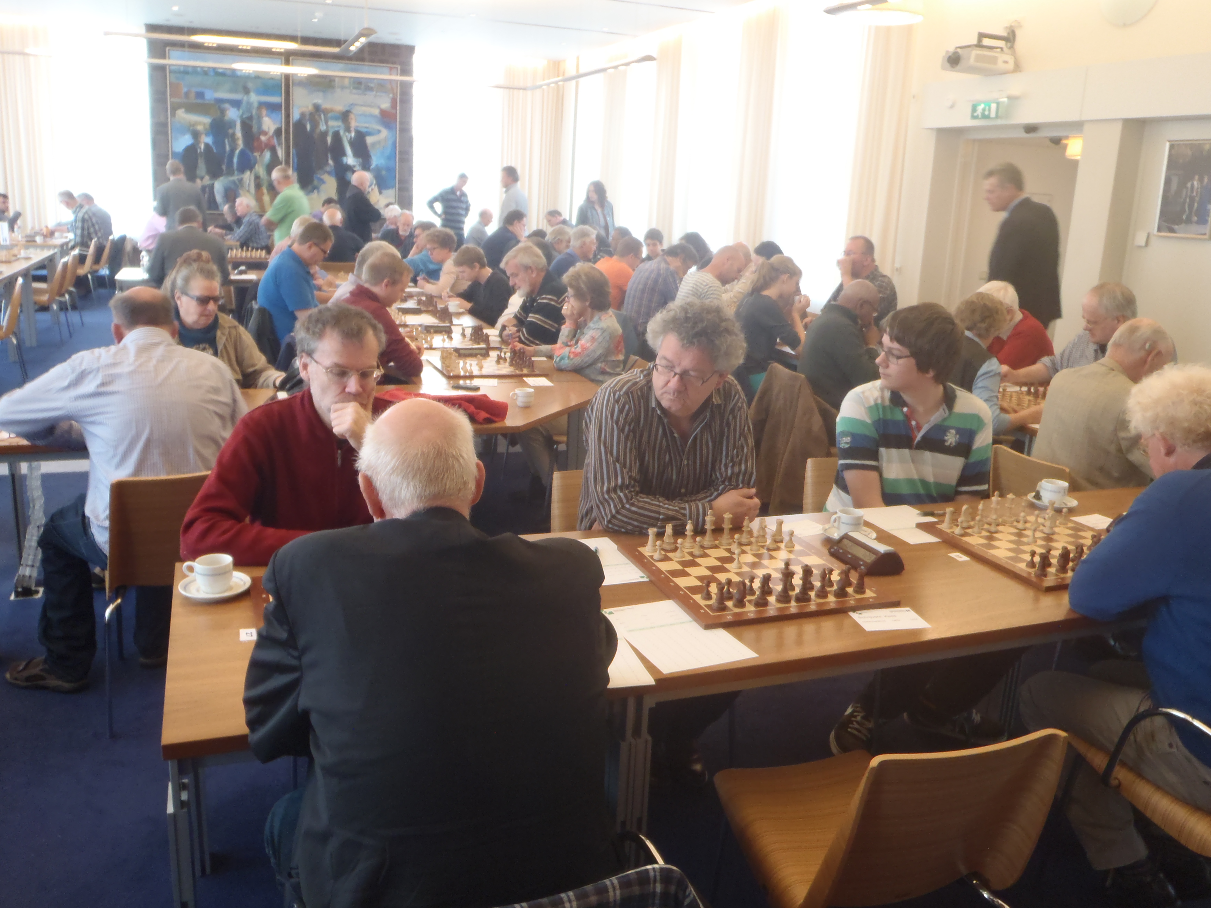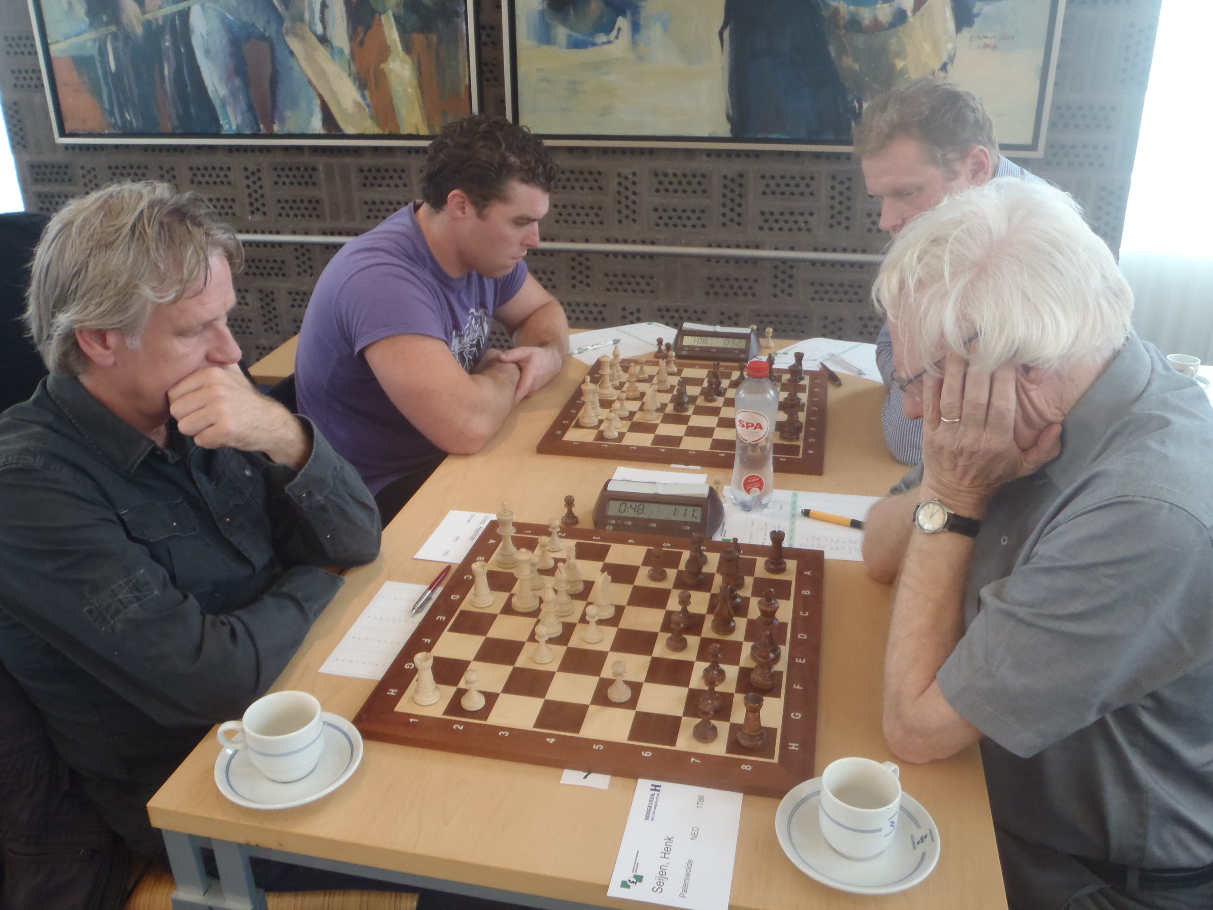 Laten we maar beginnen met de ochtendgroep. Willem moest tegen Simon Elgersma die gisteren zomaar Tinus Fleur vloerde. Willem wist dus dat hem een zware partij stond te wachten. Echter het werd een deceptie. Niet voor Willem maar voor Simon. Binnen de kortste keren had die een toren weggegeven en even later een stuk. Hierdoor was Willem als eerste klaar en na de lange zit gisteren was Willem daar niet rouwig om. Voor de supporters die ‘s-morgens kwamen om hem aan te moedigen wat minder leuk, want Willem was al klaar en bij Hans konden ze alleen nog zien dat er remise werd gegeven. Daarom ook geen foto’s deze keer.