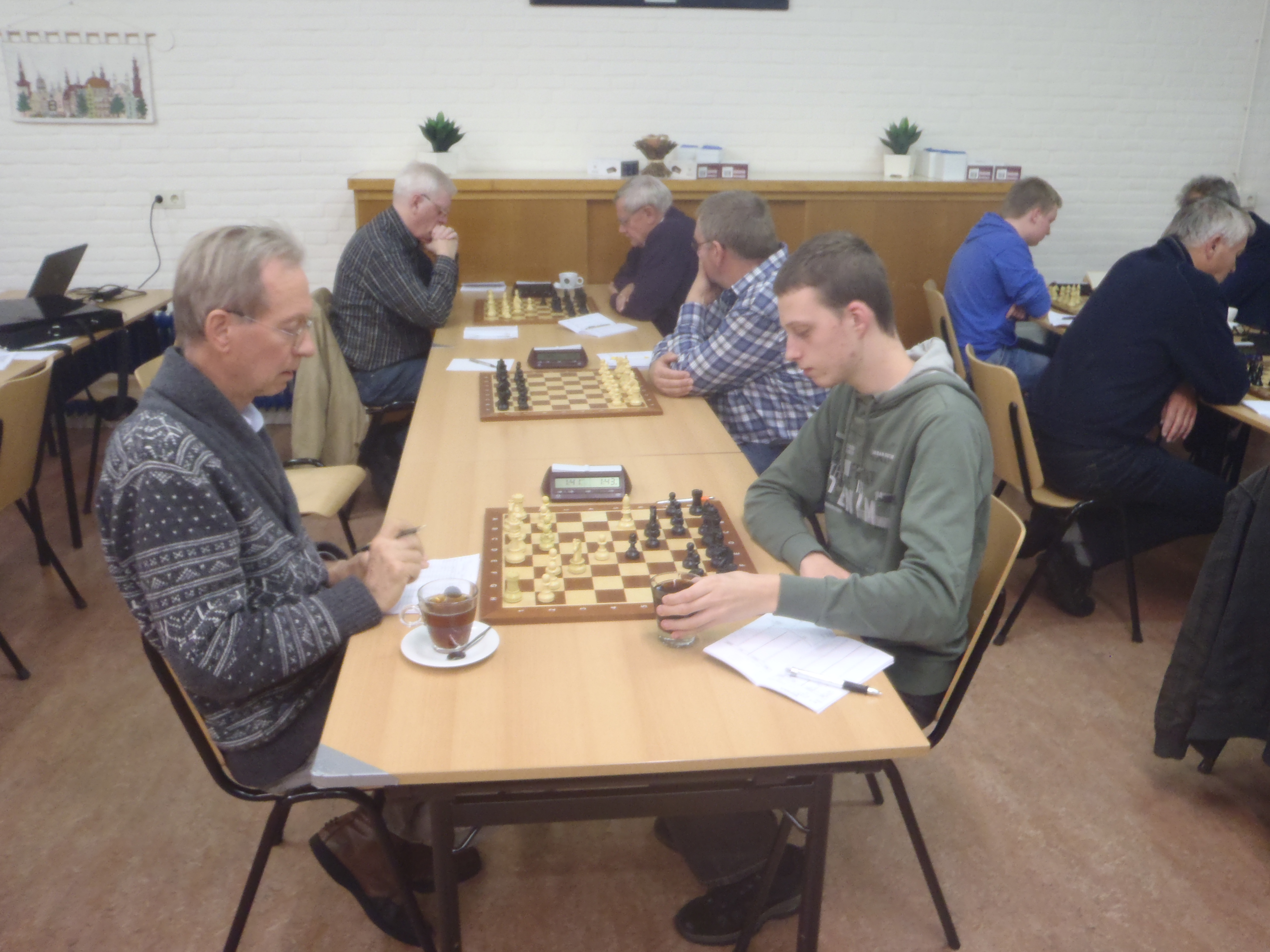 Hoogeveen 3 nam de leiding middels een overwinning van invaller? Patrick Middelkoop op Reint Harkink. Reint had de partij weer gedegen opgezet en stond de hele tijd wat beter. De toren op één diagonaal met de koning zetten was niet zo’n handige keuze. Een vijandelijke loper stelde zich zo op dat de toren gepend kwam te staan en de volgende zet van het bord verdween. ESG 3 kwam weer gelijk door een overwinning van Hans Hut op Max Stotijn. Stotijn nam een giftige pion op g6. Hij maakte er een paardoffer van, maar het resultaat was dat Hans een stuk voor stond en ook nog de aanval had. Dat was niet te houden voor Stotijn.