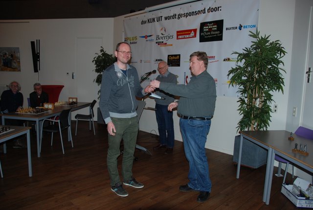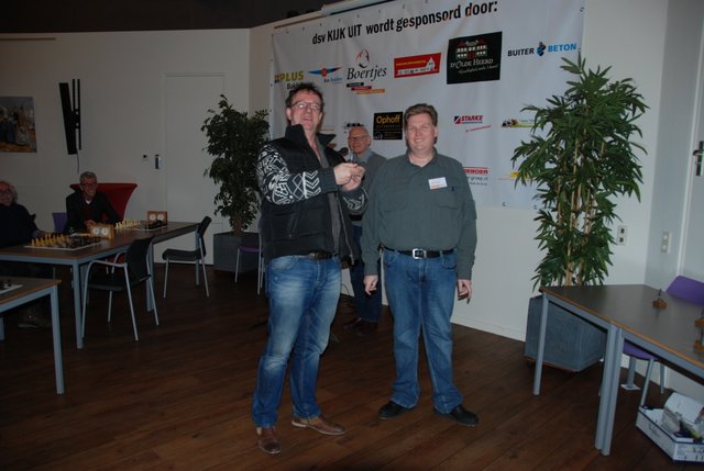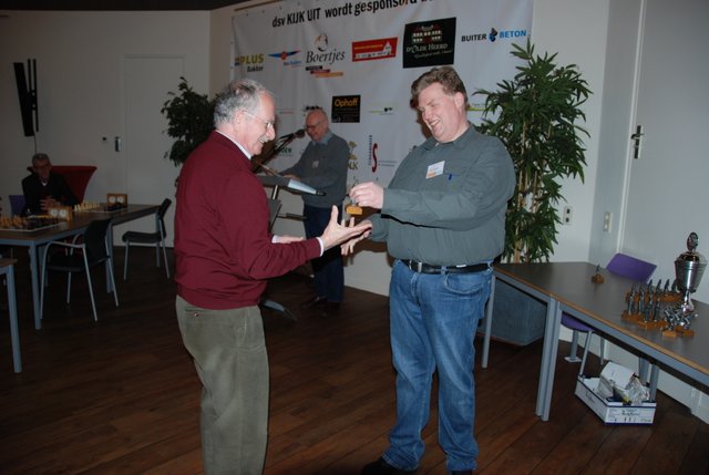 Vooraf was de lat hoog gelegd bij de vier ESG’ers die zaterdag jongstleden hun opwachting maakten op het Boertjes Schaaktoernooi te Balkbrug. Willem, Marcelis, Hans en Raymond waren respectievelijk geplaatst in de groepen 3,9,10 en 11. De doelstelling was (niemand uitgezonderd) “even een beeldje ophalen”. Het Boertjes Schaaktoernooi heeft, behalve een wisselbeker voor de toernooiwinnaar, voor de nummers 1 en 2 van elke groep een ambachtelijk vervaardigd beeldje als prijs. En ieder jaar schijnen de beeldjes mooier te worden. Met name Hans was zeer tevreden met zijn “Ambiorix”, omdat deze figuur nog een zekere connectie heeft met de plaats in België waar hij een tijd heeft gewoond. Verder was het voor mij althans een leerzame dag, omdat ik gezien heb dat je in een eindspel met twee tegen vier pionnen toch met zekerheid een remise kunt bewerkstelligen, zoals Willem in zijn derde partij, waardoor hij zijn tweede plek helemaal veilig stelde. Marcelis is volgens mijn beleving een keer miraculeus aan een nederlaag ontsnapt door vanuit het niets zijn tegenstander met de Dame mat te zetten, en moest hij in zijn laatste partij nog tot het uiterste gaan (veel tijd gebruikt) om zijn tweede plek te bemachtigen. Dan last but not least Hans en Raymond die beiden een honderd procent score haalden en dus de eerste prijs. Hans was uiteraard tevreden met zijn eerste plek, alhoewel zijn laatste overwinning, volgens eigen zeggen niet helemaal verdiend was. Raymond was steeds als eerste klaar met zijn partij, ook blij met zijn eerste plek natuurlijk, maar misschien toch wel iets te laag ingedeeld. De bovengenoemde vier zullen hoogstwaarschijnlijk volgend jaar opnieuws present zijn op het 30ste Boertjes Schaaktoernooi, en misschien dat er dan nog meer ESG’ ers zin hebben om “even een beeldje” op te halen.
