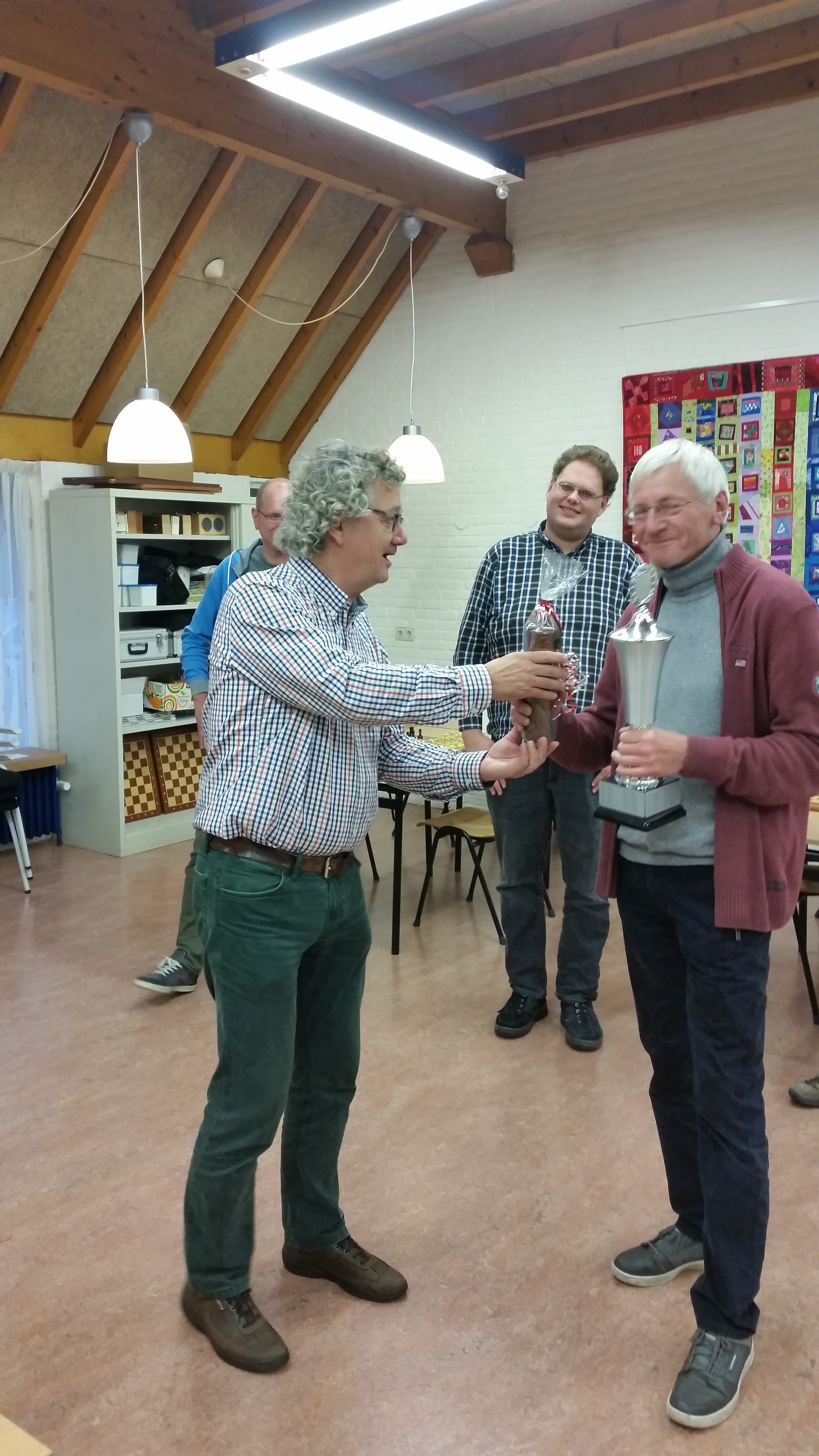 Uw verslaggever verzorgde ook de indeling. Dat kost punten, maar zelfs als we daarmee rekening houden is de 50% ver beneden mijn niveau. Ook onze clubkampioen Arie die bij Hardenberg naar sterkere tegenstanders zoekt had niet zijn avond. Mocht onder luid applaus de beker in ontvangst nemen. Er werd wel verteld dat hij nog maar 9 keer kampioen van ESG is geweest en dat wij houden van ronde getallen.