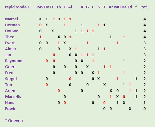 Edwin speelde maar 2 ronden mee daar hij om 21:00 uur altijd weer naar huis moet. Daardoor waren 3 leden daarna oneven.