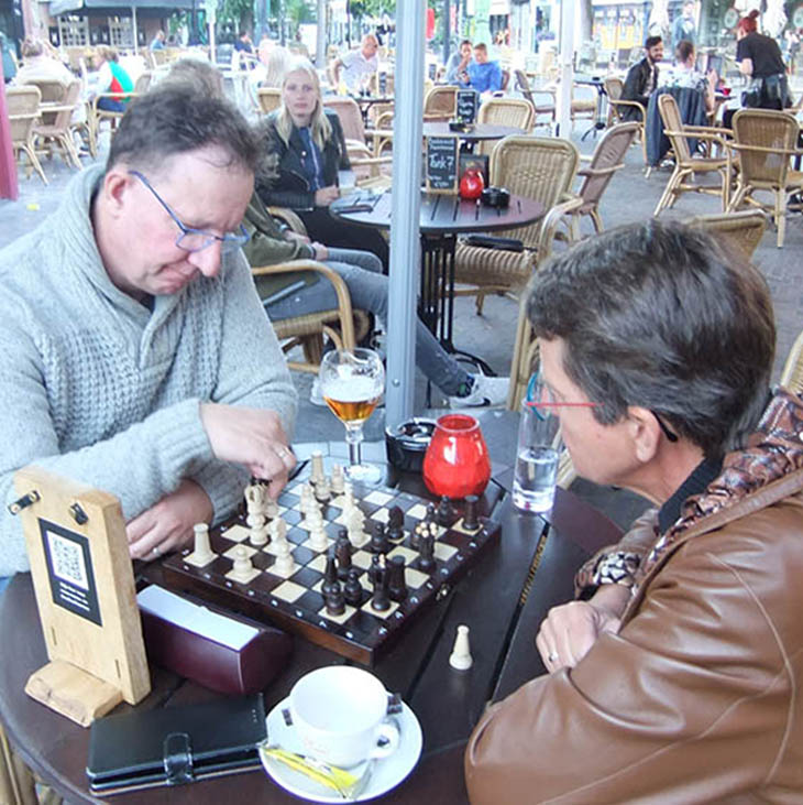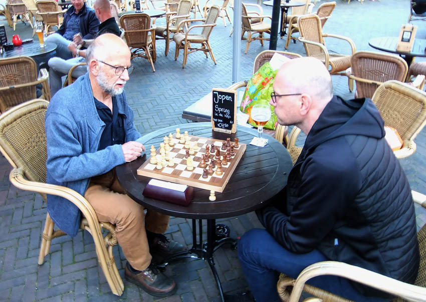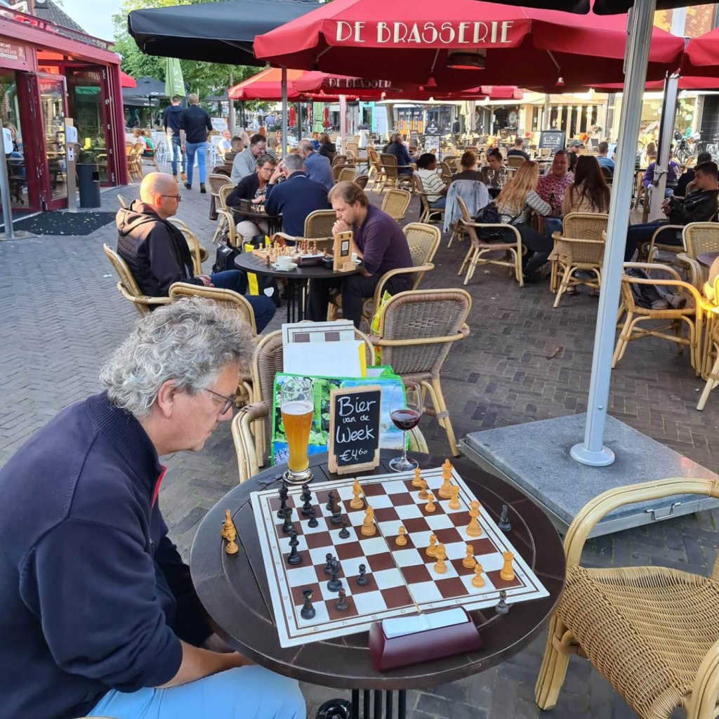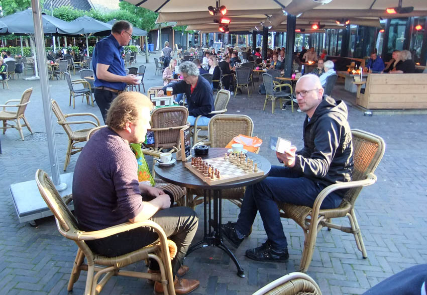 Evenals vorige week troffen een achttal leden van het ESG uit Emmen elkaar voor de tweede keer op het terras van da Brasserie. Zij kwamen daar niet alleen voor het genieten van diverse consumpties, maar meer om mooie schaakpartijen te kunnen spelen. Maar eerst was er genoeg ander gespreksstof, immers een aantal van die leden hadden elkaar sinds de laatste clubavond op maandag 9 maart elkaar niet meer gesproken vanwege de Coronacrisis. Alleen daarom was het al erg leuk om hier aanwezig te zijn. Ook mochten wij daarbij Rob van harte welkom heten en ontmoeten die tijdelijk – wellicht voor 1 jaar – graag met ons mee wil spelen.