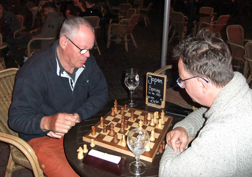 Daarna werd er volop geschaakt, leuke verrassende partijen waarbij in eens bleek dat ook de sterkeren ineens ook maar mensen waren en soms de mooiste combinaties afwisselden met “briljante” blunders…. Het viel dan ook niet altijd mee om op die kleine bordjes en onderwijl genietend van heerlijke biertjes e.d. altijd even goed bij de les te zijn. Op de foto hier boven zit Ton zijn zet te overwegen in de partij tegen Jan.