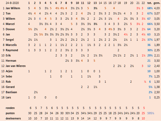 Onderstaand vind u de eindstand van deze ronde. voor de partijen ga naar Lichess.com. Daar staan in de scoretabel alle gespeelde partijen die te voorschijn komen als u op de uitslagen in die stand klikt.