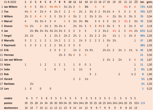 23 ronden hebben wij sinds maart gespeeld en alle ronden zijn hieronder aangegeven. Daarin is ook te zien wie het goed of minder goed hebben gedaan, hoeveel partijen er zijn gespeeld en welke spelers in deze ronden hebben gezegevierd.