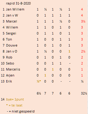 Zo kunnen wij nu zien: Dat Jan Willem in deze reeks rapidwedstrijden 10 keer als beste is geëindigd, waarbij hij 4x iemand naast zich moest duldden. Dat Willem en Douwe die samen één keer wonnen maar dat Willem 5 van deze rapidwedstrijden wist te winnen en Douwe 4 keer als beste kon worden genoteerd. Zo kunnen wij ook zien dat Jan van Os twee keer in deze reeks de winst wist te grijpen en daarbij niemand naast zich duldde. Ook Ton en Herman wonnen 2 maal, waarbij zij echter één keer samen die eerste plaats moesten delen. En dat Jan van Wieren in de laatste wedstrijd samen met Jan Willem bovenaan eindigde. In dit overzicht heb ik alleen naar het puntentotaal gekeken, niet naar de weerstandpunten waarop Lichess uiteindelijk de volgorde op de wekelijkse ranglijsten heeft bepaald.