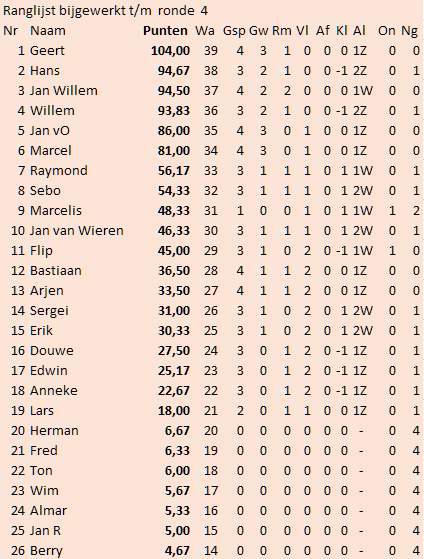 Dan de partijen van de senioren. Acht partijen op papier. Maar doordat een afzegging die al om 15.59 op zondag was verstuurd pas om 21.56 binnenkwam bij Almar betekende het een vrije ronde voor Marcelis. De tegenstander van Edwin kwam niet opdagen en toen waren er nog zes partijen. Maar wat voor een partijen. Dramatiek en vele zweetdruppeltjes.