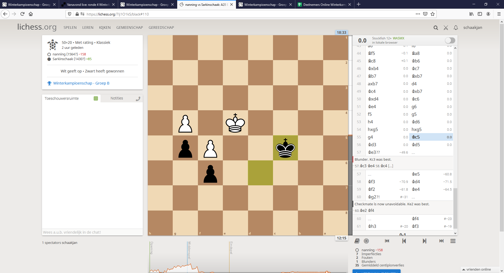 Sergei had het behoorlijk wat zwaarder en had het geluk nodig dat de tegenstander de oppositieregel vergat. Nu was de winst wel verdiend. Sergei kwam op zet 27 een pion voor en wist dit door middel van afgedwongen dameruil om te zetten in een pionneneindspel met lopers van de gelijke kleur. Daarna vatte hij het te makkelijk op. Verloor twee tempi doordat hij te laat zag hoe de koning naar voren moest. Daarvan maakte de tegenstander mooi gebruik. De computer geeft lang als oordeel 0,0 aan. Dat is ook mijn oordeel. Potremise is de term die ik dan gebruik. Maar Sergei speelde gewoon door en op zet 57 komt de blunder van de tegenstander. Zie hieronder. De witte koning moet natuurlijk naar e3 om na Kd5 de oppositie te pakken. Hij speelde echter zijn koning naar d3 en Sergei was er als de kippen bij om met Kd5 de oppositie te pakken. En hoe dat moet heeft hij geleerd op de trainingen 2,5 jaar geleden in de zomervakantie. De computer geeft nog wel de verdediging om na Kd5 Kc3 te spelen. Dat levert nog net remise op. Zoek zelf maar even uit hoe dat gaat.