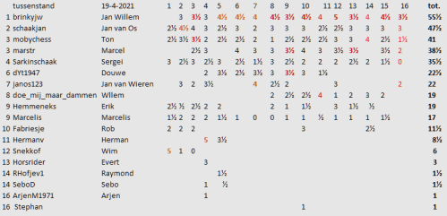 Brinkyjw was ook in de 16e ronde weer sterk op dreef; hij eindigde met 3½ uit 4 bovenaan direct gevolgd door schaakjan met 3-4 en janos123 met 2-4. Ook nu startte janos heel sterk, maar dolf het onderspit in de laatste 2 ronden tegen schaakjan en brinkyjw. Doordat schaakjan in de laatste ronde remise speelde tegen mobychess won brinky nipt deze 16e editie van onze rapidcompetitie. Zie voor de partijen Lichess.org ESG-Emmen.