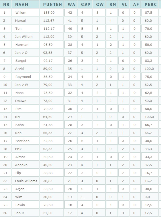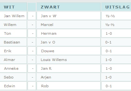 Jan vW stond wat beter maar aanvaarde het remiseaanbod van Jan Willem omdat hij hem wel kende.Willem – Marcel was een evenwichtige remise. Ook na analyse geen verbeteringen gevonden.Jan vO kwam een pion voor in een toreneindspel. Dat was remise als Bastiaan zijn f-pion eerder naar voren had gespeeld. Nu kon de koning van Jan zijn pion net ver genoeg naar voren spelen.Edwin speelde een hele goede partij. Rob had een pion meer en dat was net genoeg.