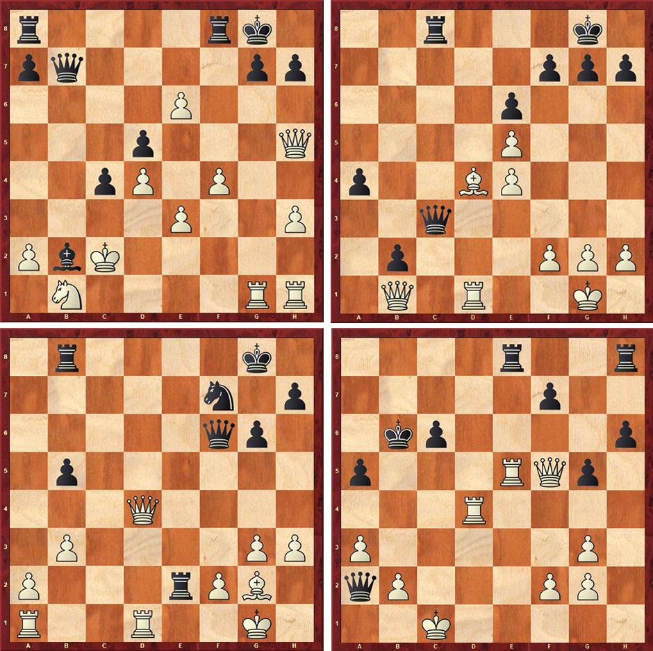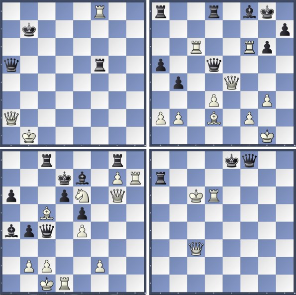 Maar, ik heb wel weer 4 mooie opgaven voor u gevonden op de schaaksite van Chess Quiz waarbij wit in de eerste en vierde opgave aan zet is en zwart in de 2e en 3e stelling. Succes met het oplossen van deze mooie schaakstellingen.