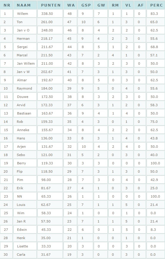 speelavond:              maandag 18:30 jeugd      maandag 19:45 senioren