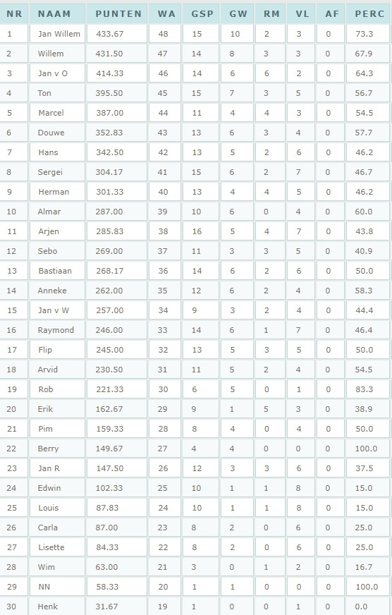 speelavond:              maandag 18:30 jeugd      maandag 19:45 senioren