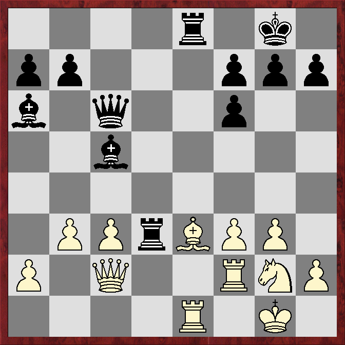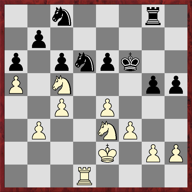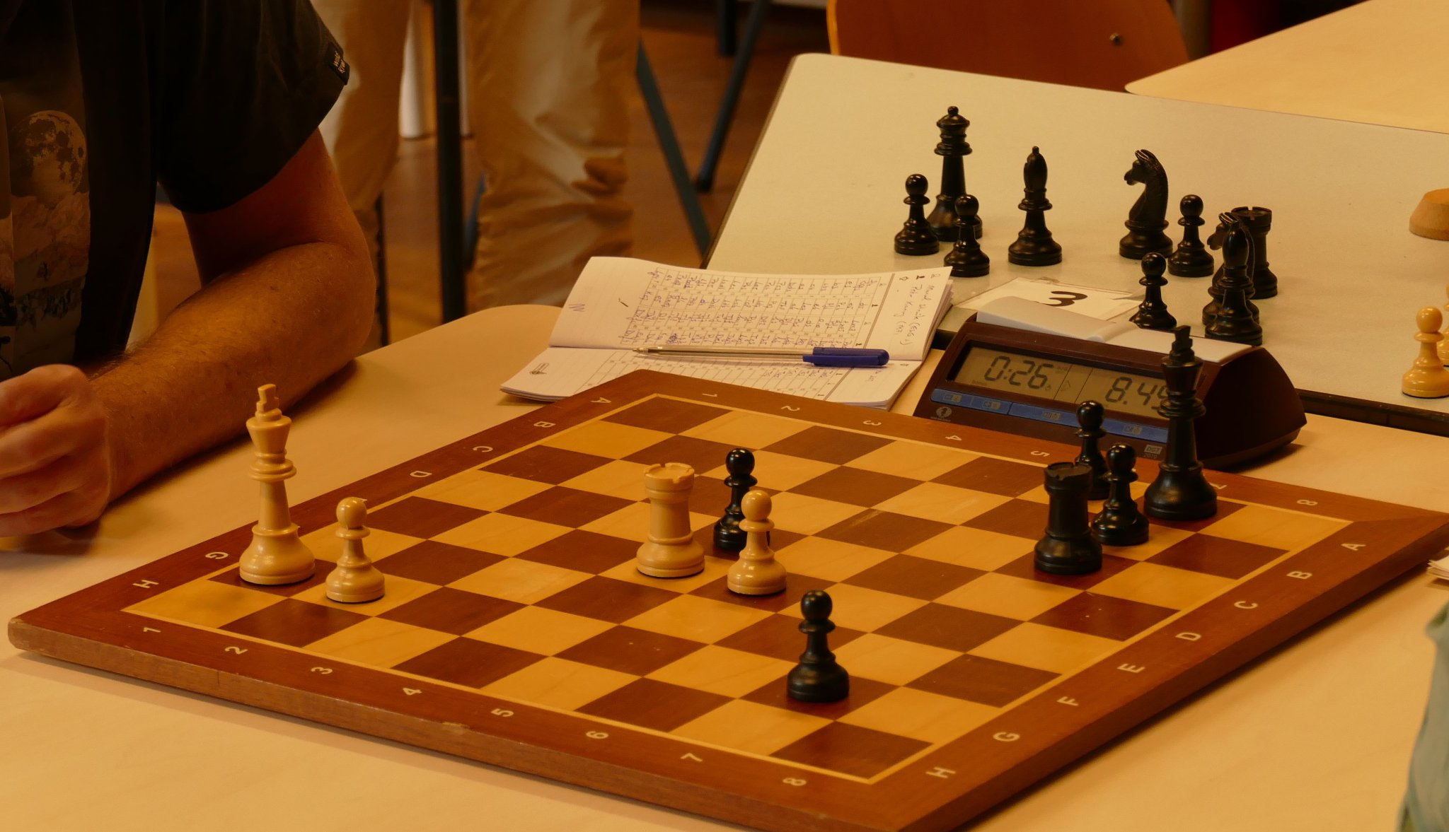 Pas veel later eindigde de tweede partij. Winst van mij bracht ons op een voorsprong. In een partij waar veel in zat moest ik goed opletten. Dat kwam mede doordat ik op wat geintjes had gespeeld middels een paard naar h4 en een pion naar g3. Doordat de tegenstander een agressieve torenzet speelde met de opzet een pion te winnen kon ik in het voordeel komen. Dat wil zeggen ik kon een stuk pakken. (zie diagram). Eén zet later gaf ik die weer terug. Flink balen, maar toen bleek dat hij het niet gezien had. Het gevolg was dat ik een toren ipv een stuk voor stond. Een paar zetten later dreigde afruil van stukken en toen vond hij het terecht voldoende.