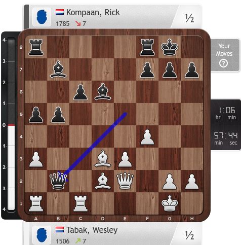Arjen: In de laatste ronde van het Hoogeveen Schaaktoernooi speelde ik tegen mede-Emmer Schaakgenootschap-speler Hans Hut. Altijd jammer als je op een toernooi tegen iemand van je eigen club moet. De partij eindigde uiteindelijk in remise, maar het leek eigenlijk nooit die kant op te gaan. In de opening kreeg Hans groot voordeel omdat mijn stukken niet goed in het spel kwamen. In het eindspel miste Hans de winnende zet en bood uiteindelijke remise aan in een stelling die erg hoopvol voor mij was. Tegen een niet-clubgenoot had ik waarschijnlijk doorgespeeld, nu ging ik akkoord, ook al omdat ik eerder verloren had gestaan. Een qua prestaties (2,5 uit 7) wisselvallig toernooi met 2 of 3 goede partijen, maar ook een paar slechte/mindere. Op alle andere vlakken was het een heel leuke week.