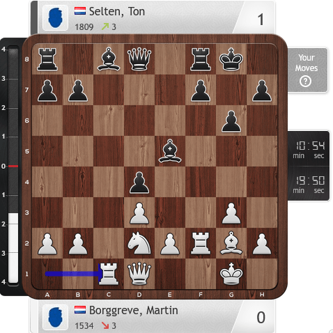 Lars was ‘s-middags als eerste klaar. Hij verloor van Martin Borggreve. De start was goed en na 18 zetten stond hij gewonnen, ondanks een stuk achter. Het afmaken is echter ook een kunst. Er is een regel dat als je materiaal achter staat je niet moet ruilen. Lars ruilde zijn dame en dat was het einde van zijn aanval en stond hij een stuk achter.