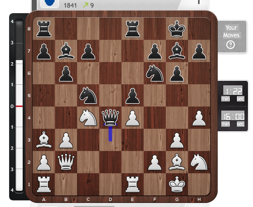 Mijn paarden waren vandaag dronken in de partij tegen Boudewijn, die sprongen overal naartoe behalve naar de goede velden. Had op een gegeven moment de pion op d3 moeten slaan met mijn paard, maar was (onterecht) bang voor de penning die zo zou ontstaan.