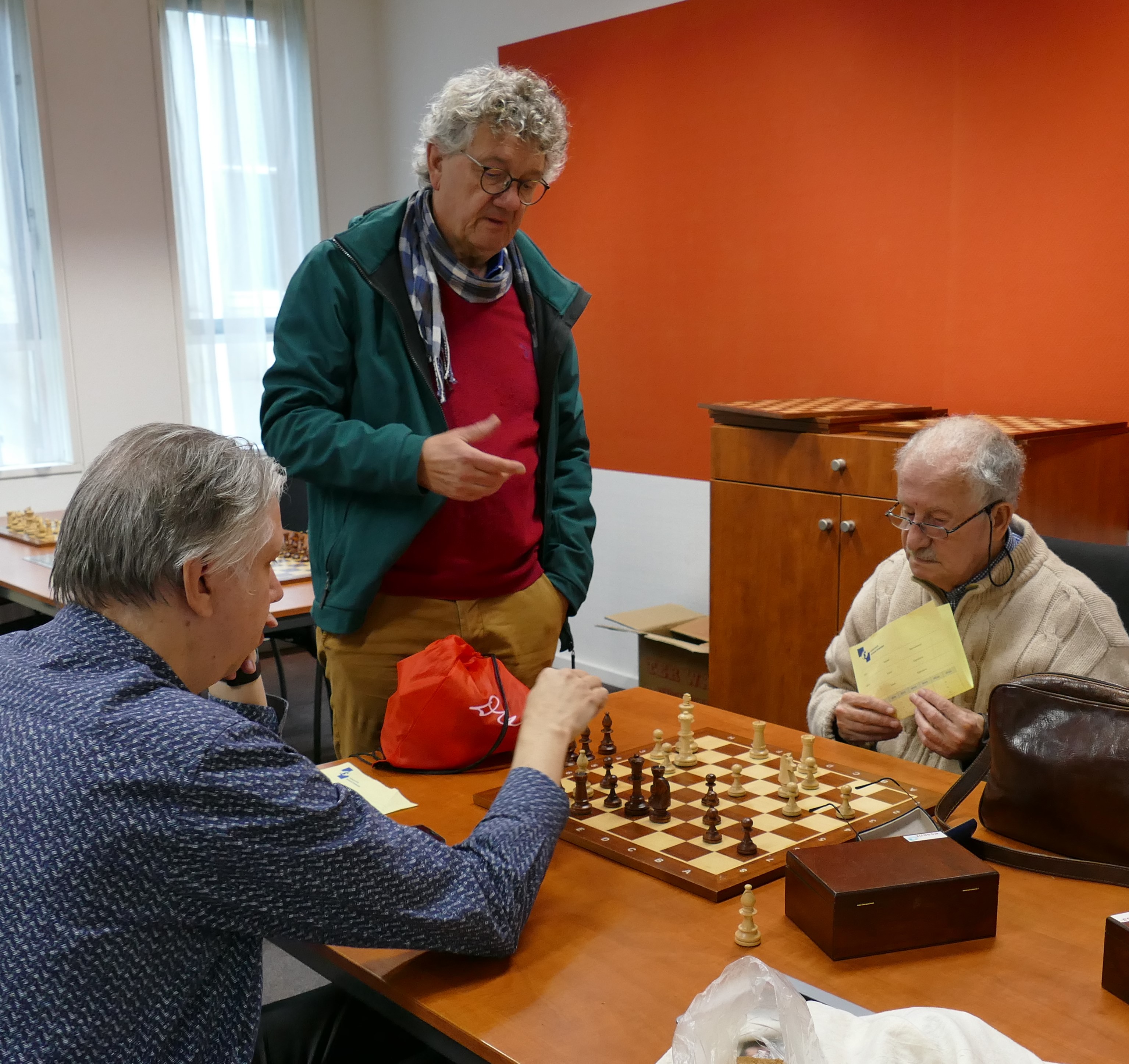 Het langst was Wesley bezig. Wat zeg ik het was de langste partij van de dag. Ze zaten een hele tijd alleen te spelen. Ook de partij aan bord 1 duurde lang, maar de bovenste 9 borden zitten in de raadszaal. Het was een mooie partij om te volgen vooral ook door de oordelen van de computer. Die ziet een loperoffer direkt waar wij als spelers dat toch wel even moeten zien (en vaak niet zien).