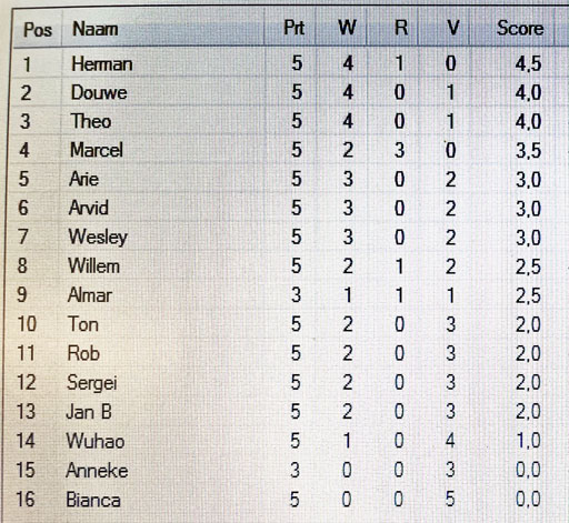 De winnaar viel op het allerlaatst. Herman had aan een remise genoeg tegen Marcel om de enige koploper te worden. Met nog 50 seconden voor Marcel en maar 9 voor Herman, mocht laatgenoemde proberen vanuit een gewonnen stelling een dame te halen en ‘even’ mat te zetten.