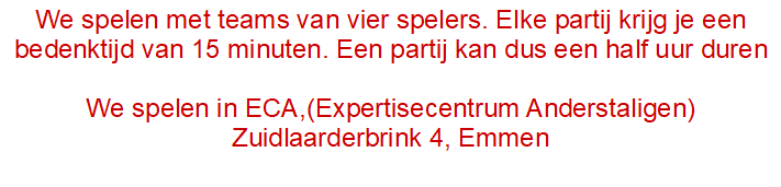 Dan zijn wij op zoek naar u! De schaakvereniging ESG in Emmen verwelkomt nieuwe leden van harte in haar vereniging. Wij spelen op maandagavond vanaf 19:45 uur (jeugd om 18:30 uur) in wijk- centrum ’t Brinkenhoes, Mantingerbrink 140 in Emmen-Bargeres.