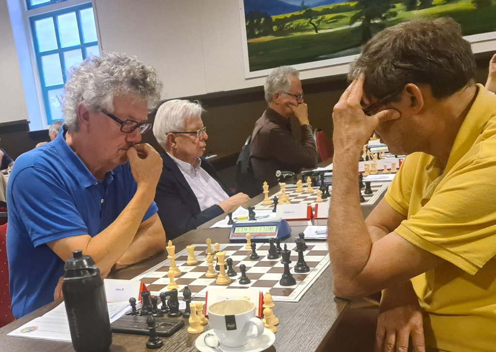 Ton ging er volgens eigen zeggen kansloos af en blijft dus op 1,5 punt staan. Morgen kan hij de 50% halen, maar dan moet hij wel winnen. Arie speelde remise tegen Jan Lootsma en mag morgen tegen Maarten Etmans. Die is met afstand de oudste deelnemer met 84 jaar. Evert won van de bij ons ook zeer bekende Gerard Grotenhuis. Volgens Ton was dit een heel knappe overwinning.