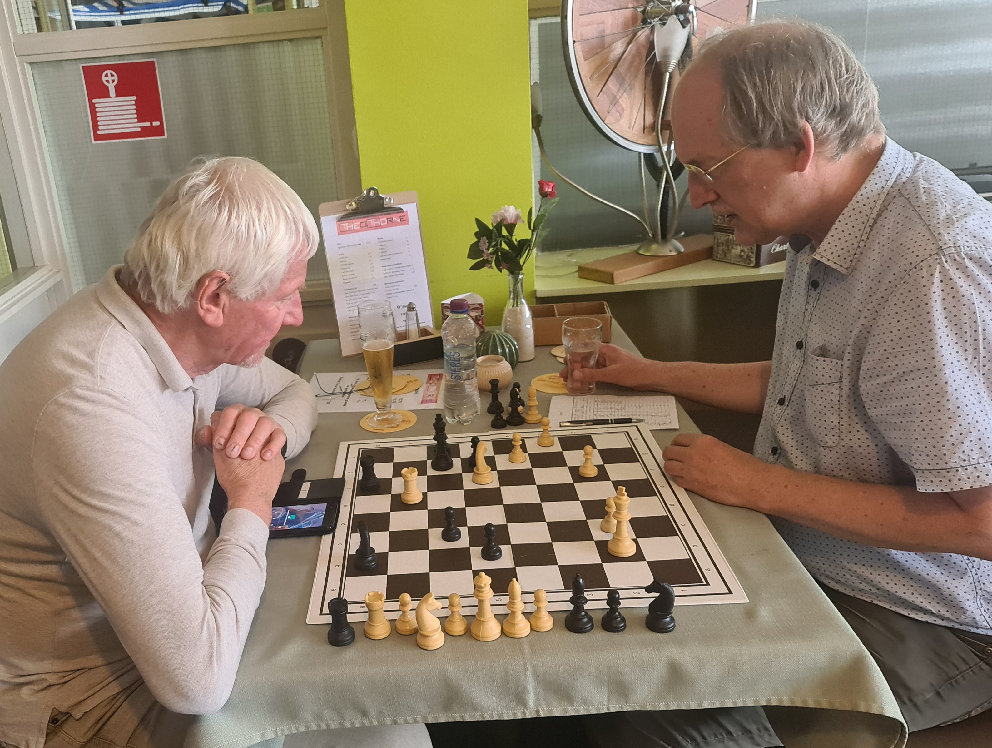 Arie wist te winnen zoals Ton op de WhatsApp al voorspelde. Ton zelf had toen al verloren in een als ik mag geloven zeer wisselvallige partij. Oud-lid Evert was toen bezig water uit graniet te persen. Dat lukte niet.