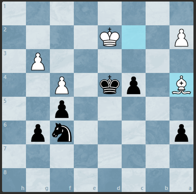 Hier win ik echter gewoon de pion, aangezien na Nc5 en Bb5 ik a6 heb. Hij moet terug naar c6 en ik kan vrij de pion oppakken. Nadat ik deze vrijpion had gecreëerd kon ik het spel bepalen. Wat volgde was een eindspel van ongeveer 3 uur, waarbij het voor mij langzaam naar voren schuiven was, en voor hem consolideren en de pion blokkeren, wat hem prima lukte. Uiteindelijk kon ik met een vork op zijn 2 stukken er in ieder geval eentje afruilen, hij mocht kiezen welke en koos voor een paard tegen loper eindspel.