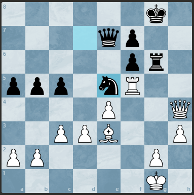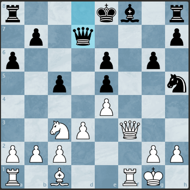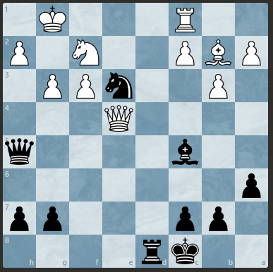 Hier was mijn 1e instinct de zet de uiteindelijk de top-keuze is van de computer. Na4. De dame kan niet nemen vanwege Qf7+ Kd8 Qxb7. Verschillende soorten mat dreigen via Bg5 en Rf7. Echter ik zag niet direct de Qxb7 zet, die gewoon einde oefening is. Hierdoor speelde ik geen Na4 maar eerst Bg5 om lange rokade tegen te gaan, ook nog prima.