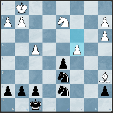 We beginnen met zwart, hopelijk nu een wat ‘normalere’ opening en niet weer 1. f4 😉 . Mijn tegenstander Tijmen begon met 1.e4, dus volgde er een Caro Kann uit mijn kant. Ongeveer 15 minuten en een boel theorie later waren de zware stukken van het bord, maar was de rest nog over. 2 Paarden voor mij tegen Paard en Loper voor Tijmen. Hij had een pion extra, echter was dit een dubbelpion aan de rand van het bord, dus de positie was redelijk gelijk. Ik wisselde een van de pionnen in het centrum af voor een betere positie van mijn paardjes, waarna hij hetzelfde probeerde met de volgende stelling:
