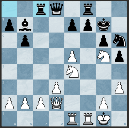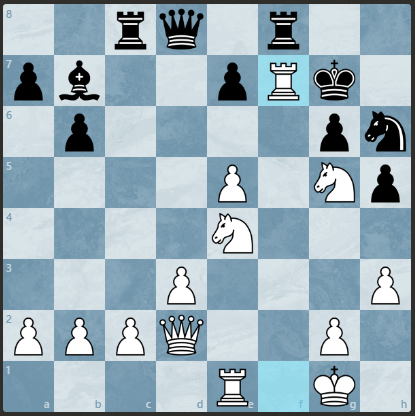 Dit is echter wel de “beste” suggestie vanuit de computer. Rxf7 is nog erger, aangezien nog steeds Ne6 blijft bestaan en daarna zelfs het paard op h6 valt.
