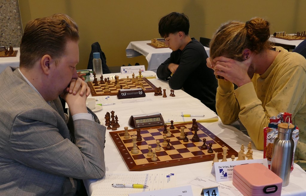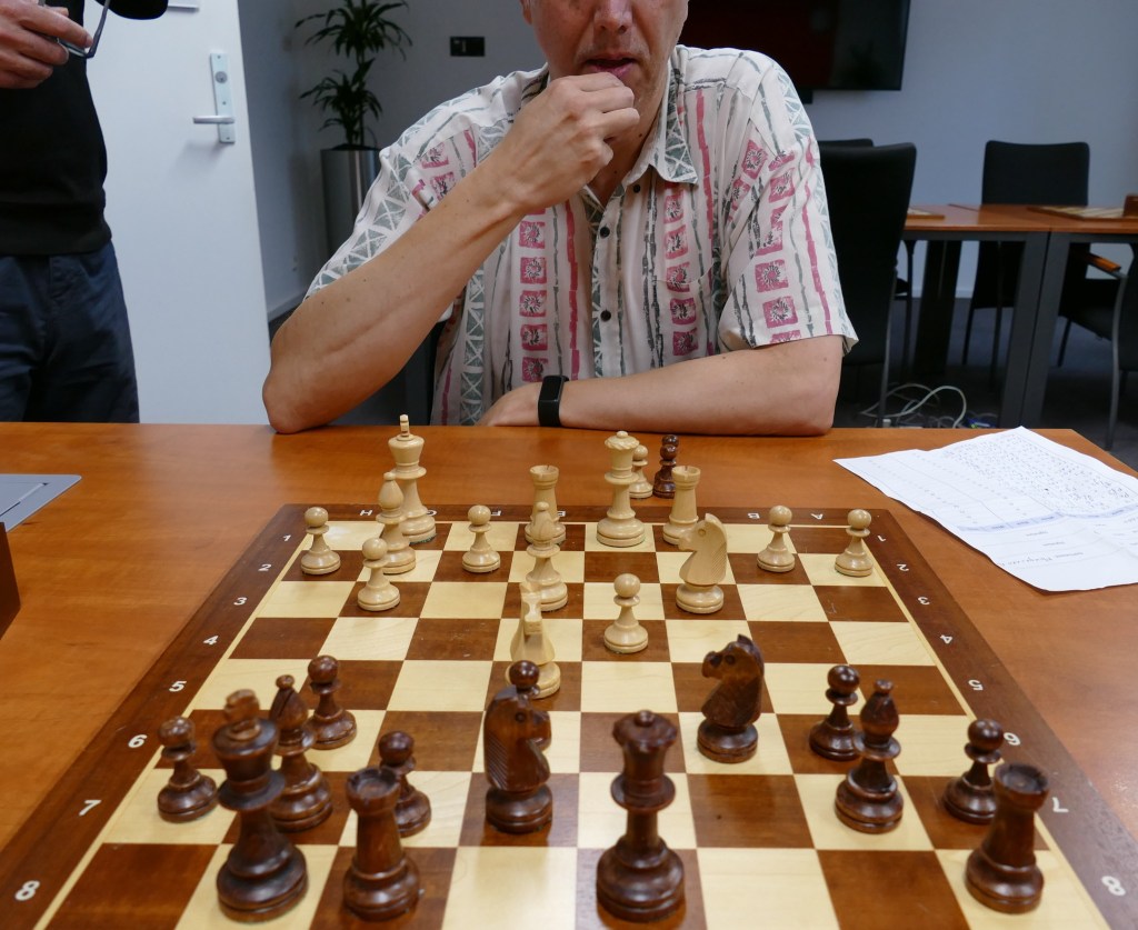 In de ochtendgroep spelen Arjen en Evert. Beiden verloren in de eerste ronde. Arjen nam niet de controle over de vrije c-lijn dus deed zijn tegenstander dat. Die kon hierdoor binnendringen op c2 en dat kostte Arjen twee pionnen. Een goede les. In bovenstaande stelling heeft Arjen goede kansen na Pb5 of a4. Het gespeelde Pd2 was te passief.