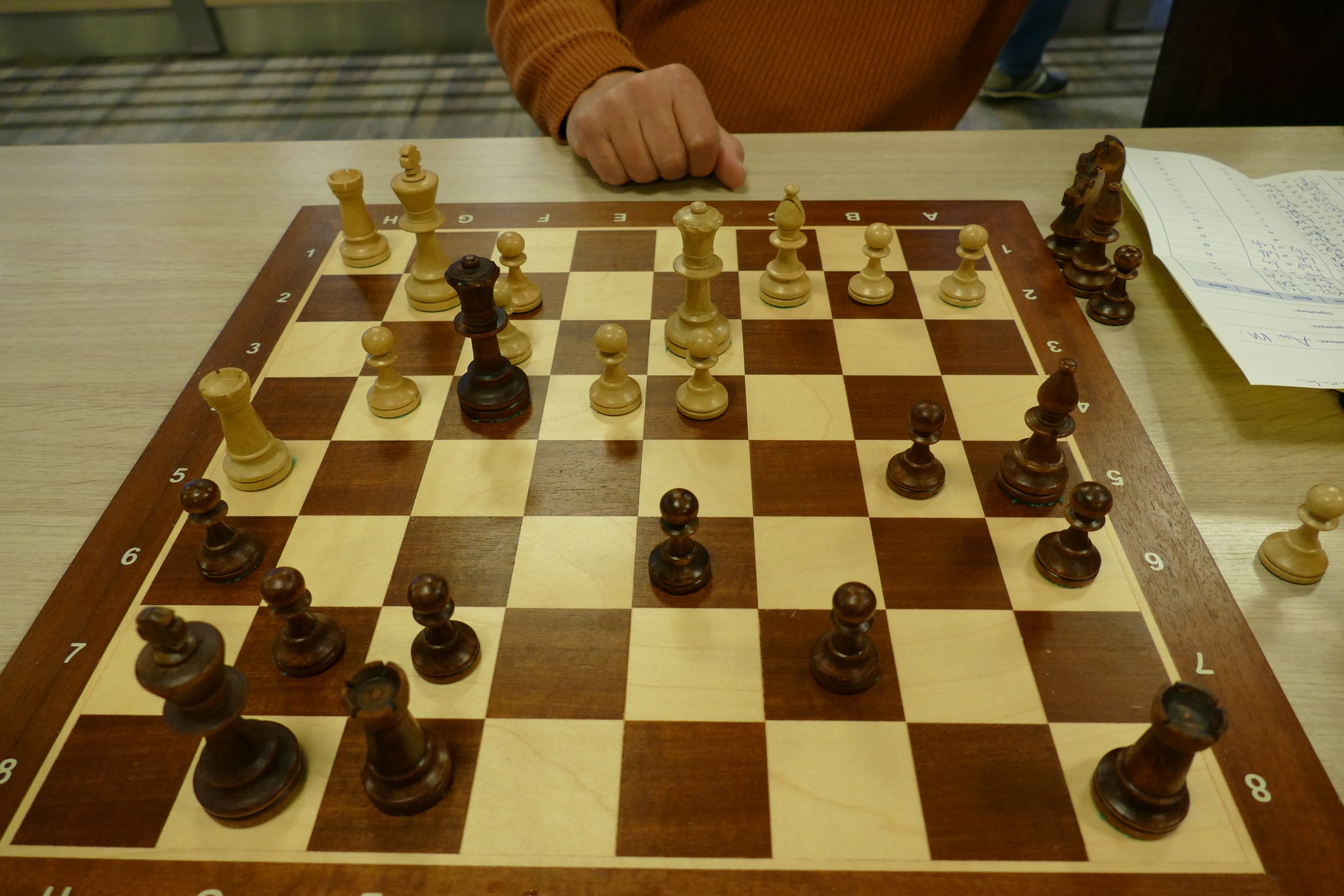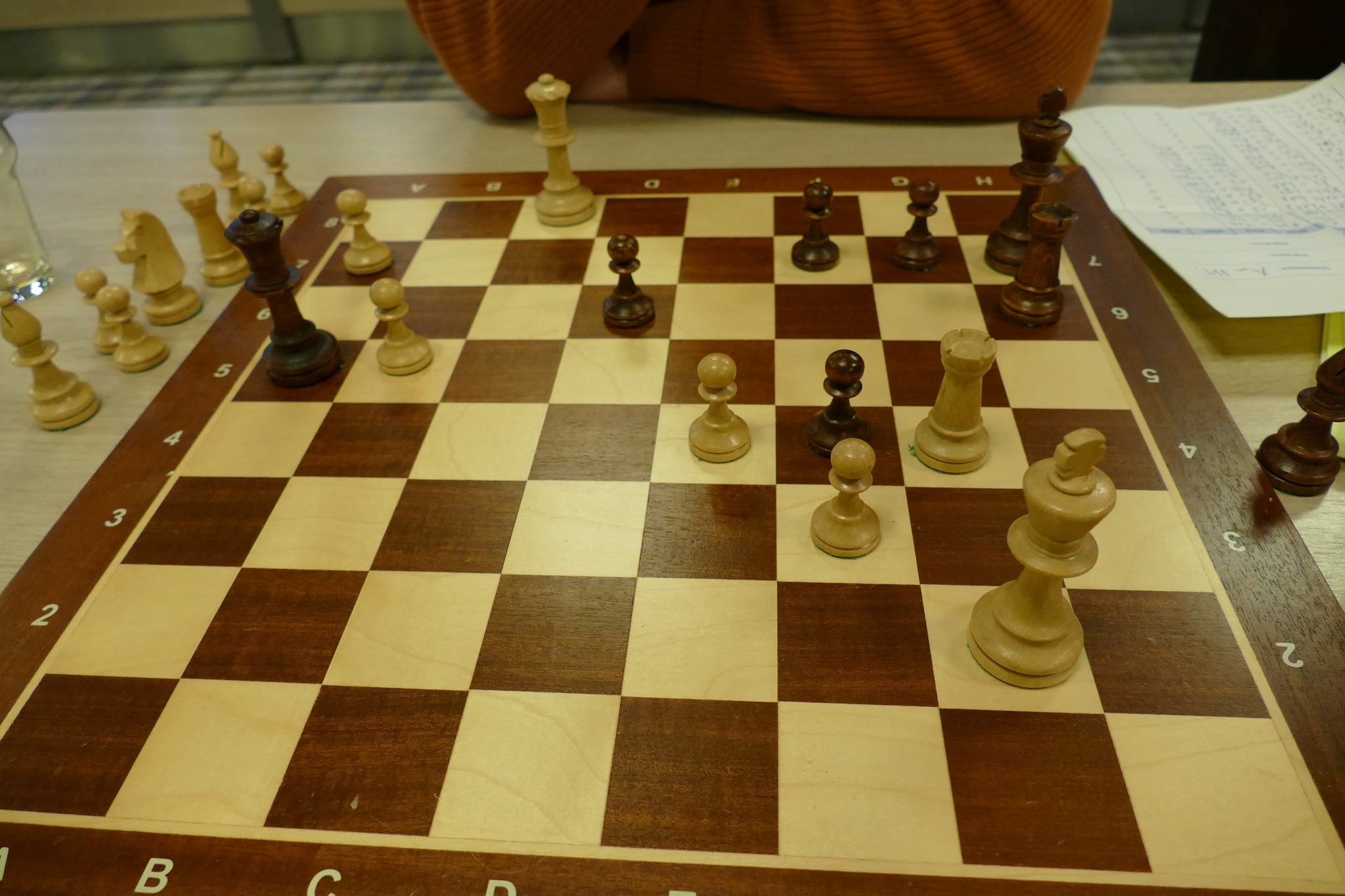 Hieronder de eindstelling van de morgen. Ton stond overwegend tegen Sono Folkers maar wist niet hoe te winnen. Tegen zijn karakter in ging Ton verdedigen en kwam verloren te staan. Gelukkig was hij wel alert op tegenkansen en dat leidde er toe dat Folkers eeuwig schaak gaf. Het alternatief was om zich mat te laten zetten.