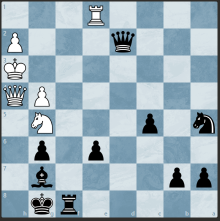 Hij had toch over het hoofd gezien dat alles gedekt stond en dat zijn aanval niet kon doorzetten zoals verwacht, mede door een penning op zijn eigen koning van zijn sterktste aanvaller. Na nog meer afruilen kwamen we uit bij de volgende toch redelijk penibele positie: