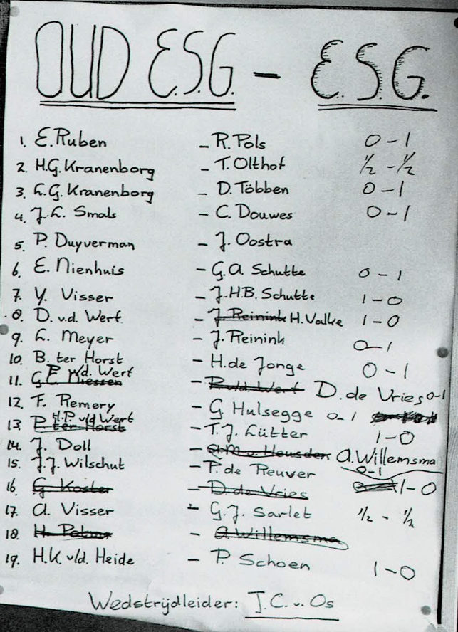 De wedstrijd werd gespeeld in de bovenzaal van Grimme aan de markt. Zonder de computer werd de stand bijgehouden op papier. U ziet dat er op het laatste moment nog wat wijzigingen moesten worden aangebracht.. Slechts drie namen zijn nu nog lid van ESG. Dat zijn D.Többen, J.Reinink en de wedstrijdleider J. van Os. Op zich niet zo verwonderlijk want dit was natuurlijk wel meer dan 40 jaar geleden.