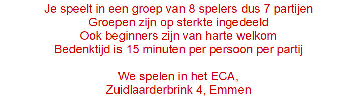 Dan zijn wij op zoek naar u! De schaakvereniging ESG in Emmen verwelkomt nieuwe leden van harte in haar vereniging. Wij spelen op maandagavond vanaf 19:45 uur (jeugd om 18:30 uur) in wijk- centrum ’t Brinkenhoes, Mantingerbrink 140 in Emmen-Bargeres.
