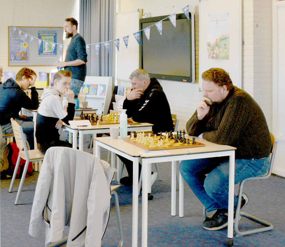 Nog voordat wij een reglementaire nul moesten noteren wegens niet op komen dagen van Lars, die aan bord 6 was gedacht, had jeugdspeler Hao al een vol punt gescoord waarmee hij op 2 uit 2 kwam. In een vlot gespeelde partij werd uiteindelijk het evenwicht doorbroken door de enorme pionnenstorm die zijn tegenstander kansloos liet. Niet veel later dolf Flip het onderspit vanwege een onweerstaanbare mataanval. Arvid herstelde het evenwicht door in al betere stelling eerst een pion te winnen, vervolgens de kwaliteit en daarna de partij. Ton stond prettig vanuit de opening die zijn tegenstander te angstig behandelde, zijn dame en loper zaaiden verderf en het liep regelrecht naar mat. Over de remise van Wesley mochten we tevreden zijn, hij stond echt onprettig en wist een stelling met 2 pionnen minder toch nog te neutraliseren.