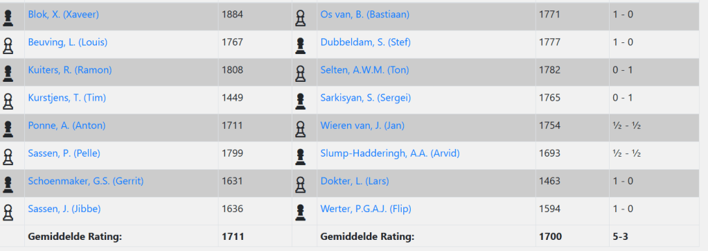 Eerder zag ik Arvid remise overeen komen in een stelling die misschien wel gelijk te waarderen is, maar waar de ongelijke materiaalverhouding in mijn ogen nog wel interessant spel had kunnen opleveren. Omdat Arvid er mentaal niet echt op was voorbereid om een partij te spelen, er was een misverstand in het spel waardoor we hem bij praktisch voor vertrek nog uit de supermarkt moesten plukken, kunnen we dit gelijke spel billijken. Daarna Flip verliezen, wiens twee ver opgerukte pionnen op de g en h lijn niet op konden tegen de stukkenovermacht aan de overkant van het bord. Lars ging ten onder aan stellingspech (het tegenovergestelde van stellingsgeluk). Hij had de partij netjes opgezet en het leek al voorzichtig richting remise te gaan, totdat zijn witte dame en toren op dezelfde diagonaal stonden als door de loper van zwart betreden kon worden, ergo kwaliteitsverlies, waarna er geen redden meer aan was. Bastiaan speelde een mooie partij, waarin zijn zij-aan-zij oprukken van de f, g, en h -pionnen mij erg aansprak. Maar hij speelde niet tegen de eerste de beste, en dat worden onnauwkeurigheden hard afgestraft. Zo zal het gegaan zijn, Verrassend snel was het met hem gedaan. Dat leverde een tussenstand van 0,5 – 3,5 op in ons nadeel.