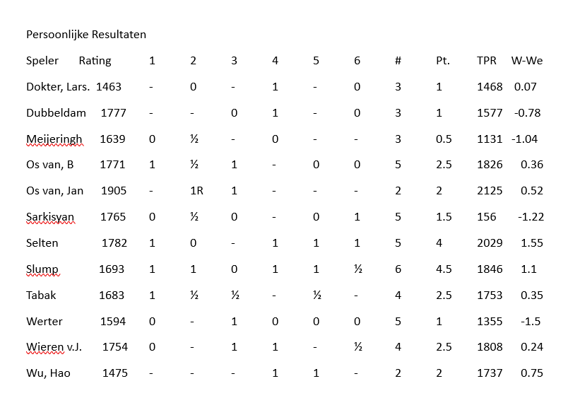 Die winst maakte de tussenstand 4 – 3 in het voordeel van T.A.L. 3. Alleen Stef was nog bezig, zijn winst zou voor het team een gelijkspel betekenen. In mijn ogen kon hij bogen op wat ruimtevoordeel en een veiliger positie van de koning, Stef kwam over de flank, zijn tegenstander organiseerde druk vanuit het centrum, het was spannend en ingewikkeld, totdat Stef naar eigen zeggen een combinatie net een halve zet te weinig doorrekende, wat zijn dame in een niet te redden parket bracht. De compensatie was onvoldoende. Verlies.